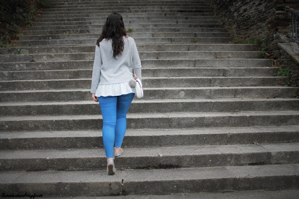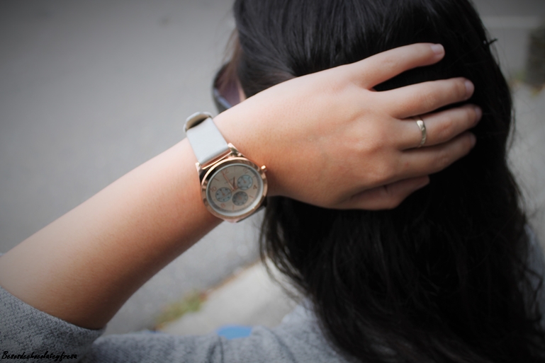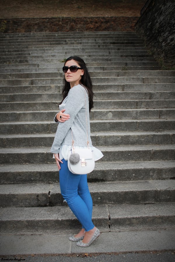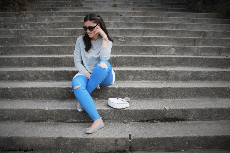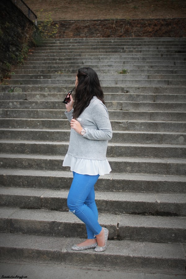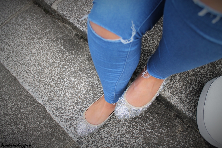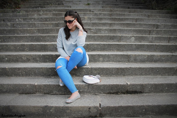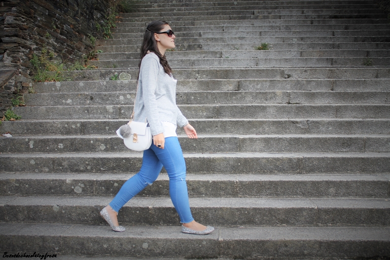 Completo el look con jeans con rotos en las rodillas, bailarinas de lentejuelas plateadas, tan en tendencia esta temporada, bolso blanco con pompón gris y mi nuevo reloj, regalo de cumpleaños de la marca Parfois. ¿Qué os parece?