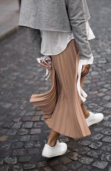 Con faldas plisadas y camisa asomando, con zapatillas bajitas tipo adidas classic, con vaqueros mom fit...