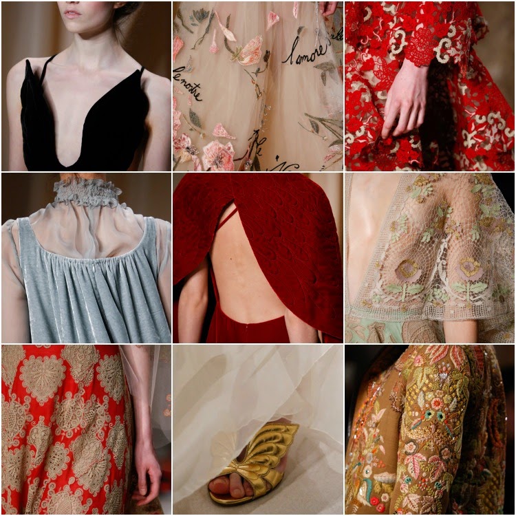 Valentino sigue en clave, cortesana-ninfa-etérea-princesa-quenuncahacomidococido. Que conste que me encantan esos vestidos a base de capas de gasa bordada con mensajes amorosos en latín, esos tejidos que parecen estar tejidos por ordas de elfos, esos cuellos con mini golas (que seguro que a mí me picarían y me saldría urticaria) y esas capelinas dignas de Cenicientas modernas.