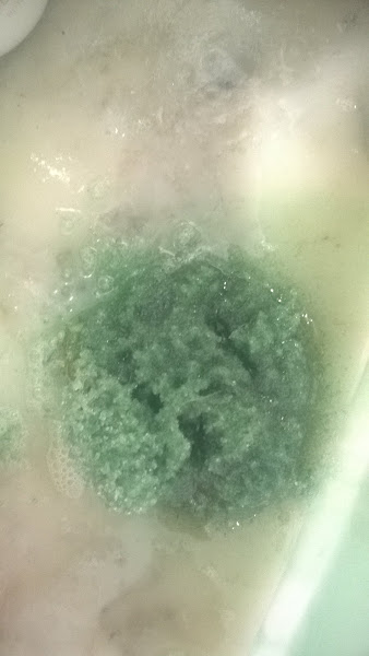 LLego a casa, me ducho y la dependienta me dijo cuando te hayas duchado, lo coges y ya trabajas la zona con el exfoliante. Cual fue mi sorpresa que, al cogerlo con la mano mojada (lógicamente estaba dentro de la bañera) se empezó a deshacer y se me puso toda la bañera verde. Os enseño fotos.
