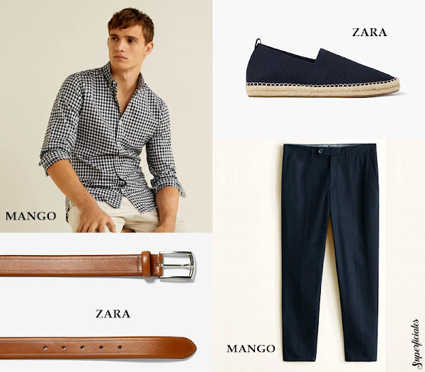 Look para él: Un look básico pero muy elegante y perfecto para el verano. Camisa de cuadros vichy de Mango, esparteñas de Zara y pantalón chino de Mango, todo en azul marino. Cinturón de piel de Zara.