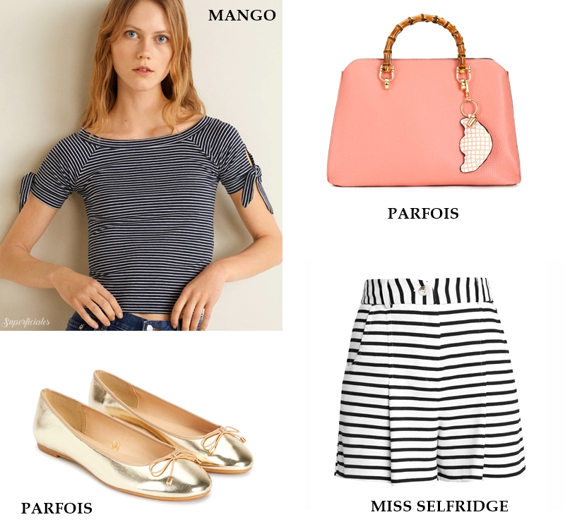 Look para ella: Camiseta de rayas de Mango, bolso de mano de Parfois, bailarinas de la misma marca en tono dorado, y falda de rayas horizontales de Miss Selfridge.