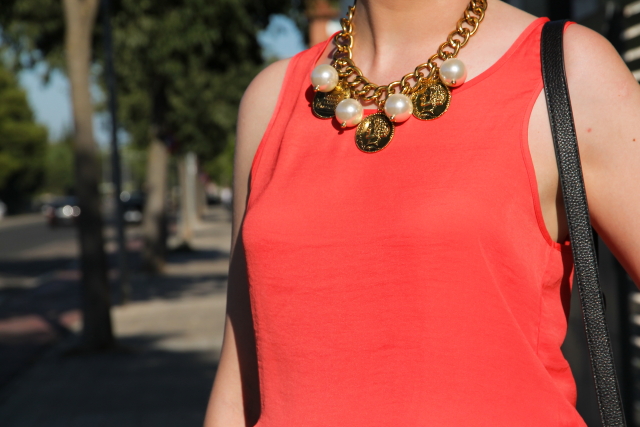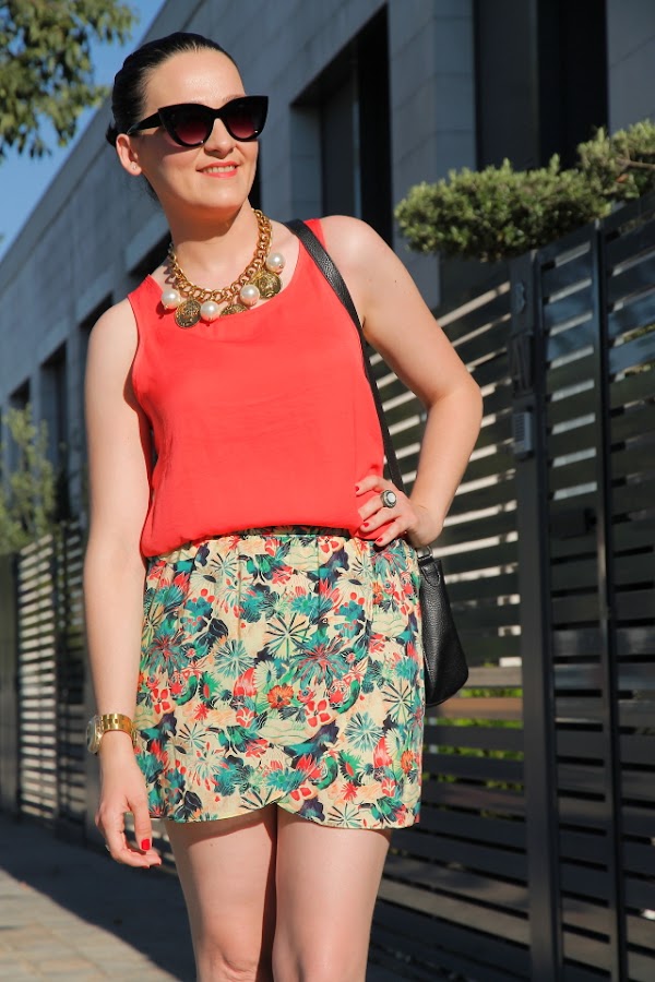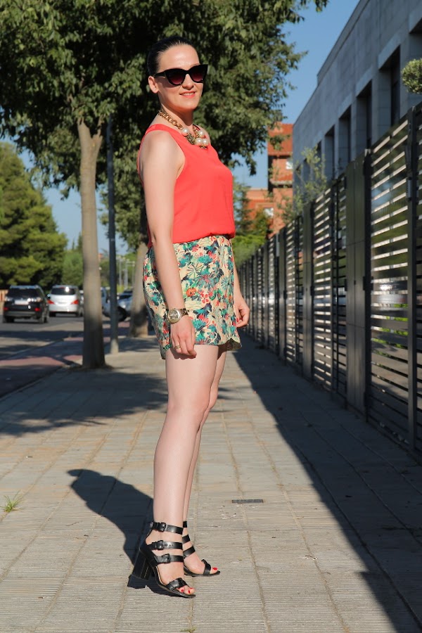 Después de unos días con un tiempo más propio de la primavera que del verano por fin han llegado los días calurosos que te hacen pensar bien los estilismos antes salir a la calle y poder soportar las altas temperaturas. Para afrontar el calor nada mejor que el pelo recogido en un moño de bailarina, y para vestir prendas livianas como el top y la falda con estampado tropical que llevo hoy. El resto del look con complementos sencillos: sandalias de tiras, bolso estilo Phillip Lim y collar de perlas XXL que es la excepción ya que poco tiene de sencillo, cada vez que me lo pongo capta todas las miradas.
