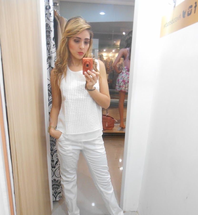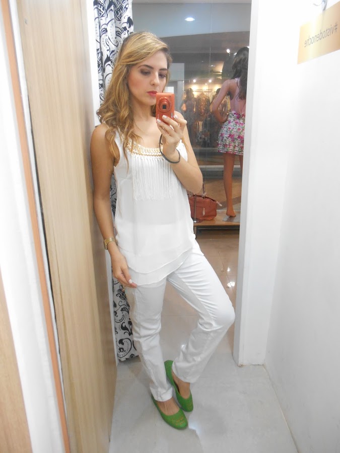 Blanco total Look, con un plus de bailarinas verdes para añadir color.
