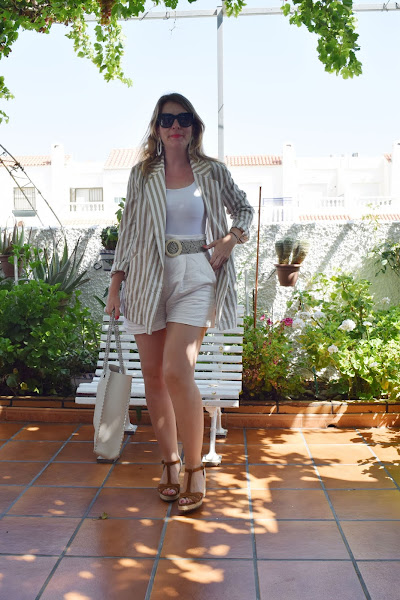 El look está compuesto de un short blanco, camiseta blanca y blazer fina de rayas. Complementos sencillos, un bolso también en color blanco y unas cuñas de piel marrón. Poco más para conseguir el efecto deseado.
