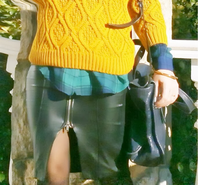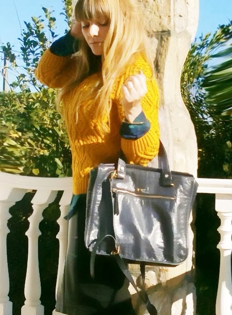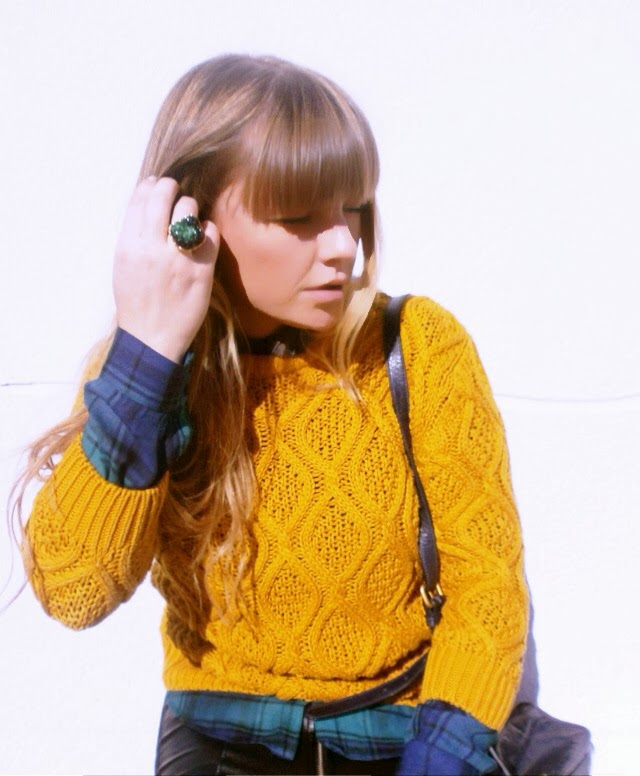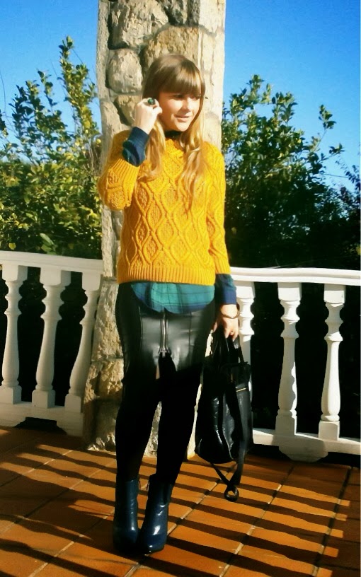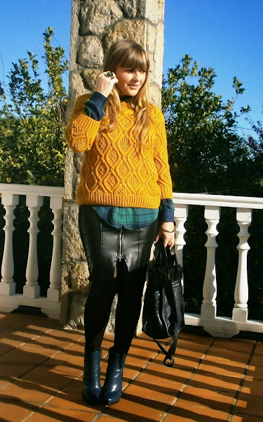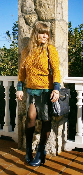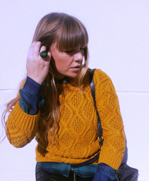 Me he decidido a combinarla con camisa de cuadros y jersey de punto grueso mostaza para restarle ese aire agresivo que tiene.