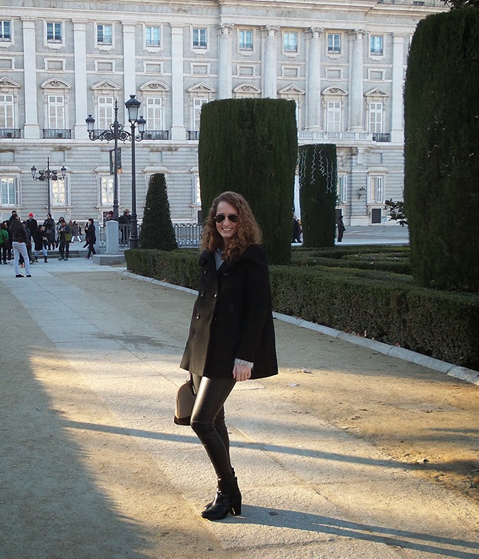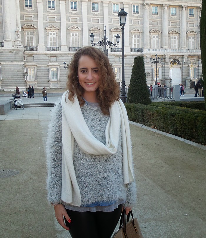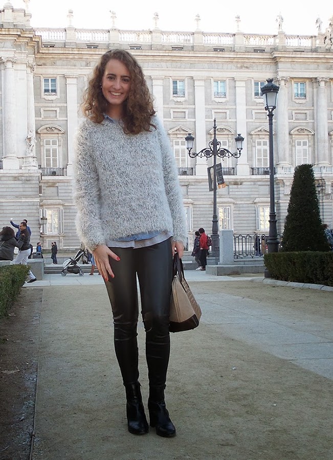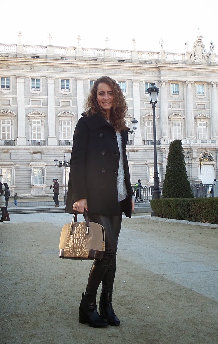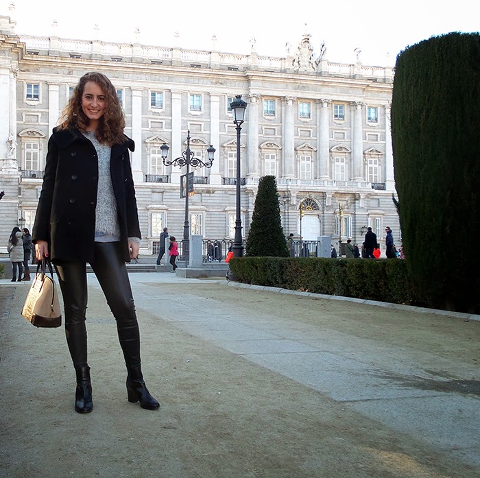 Hoy os enseño un conjunto perfecto para pasear una tarde soleada pero fría por el centro de Madrid. Como piezas claves mis pantalones negros tipo cuero y mi nuevo bolso en tono beige.