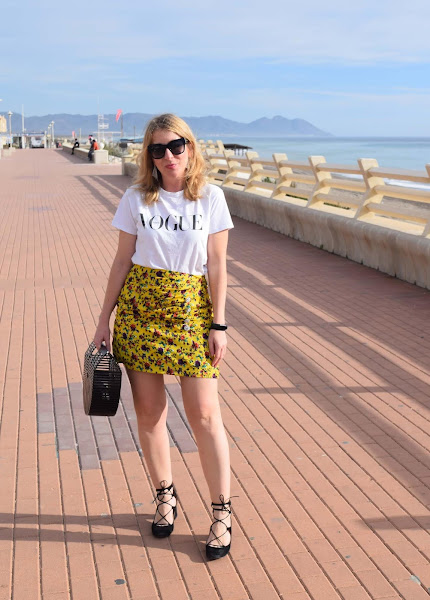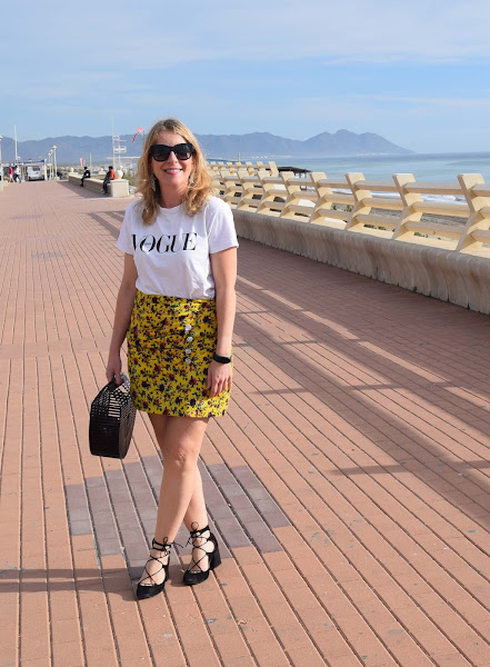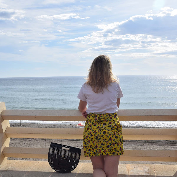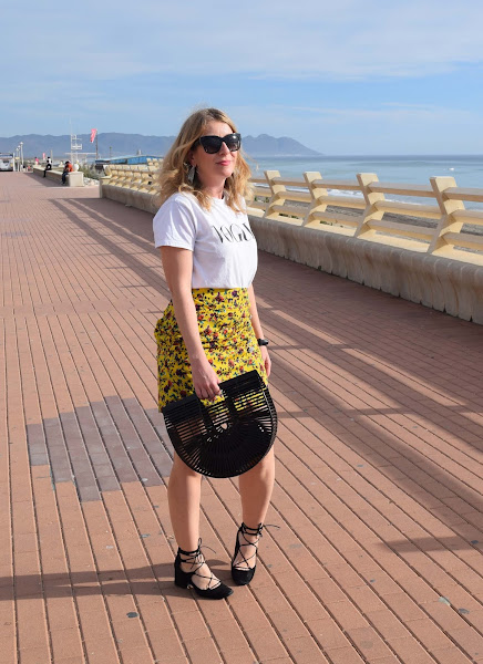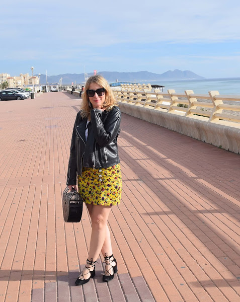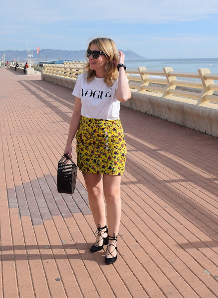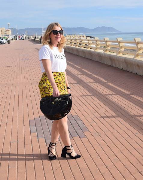 Mini en color amarillo vibrante, camiseta sencilla y complementos en negro.