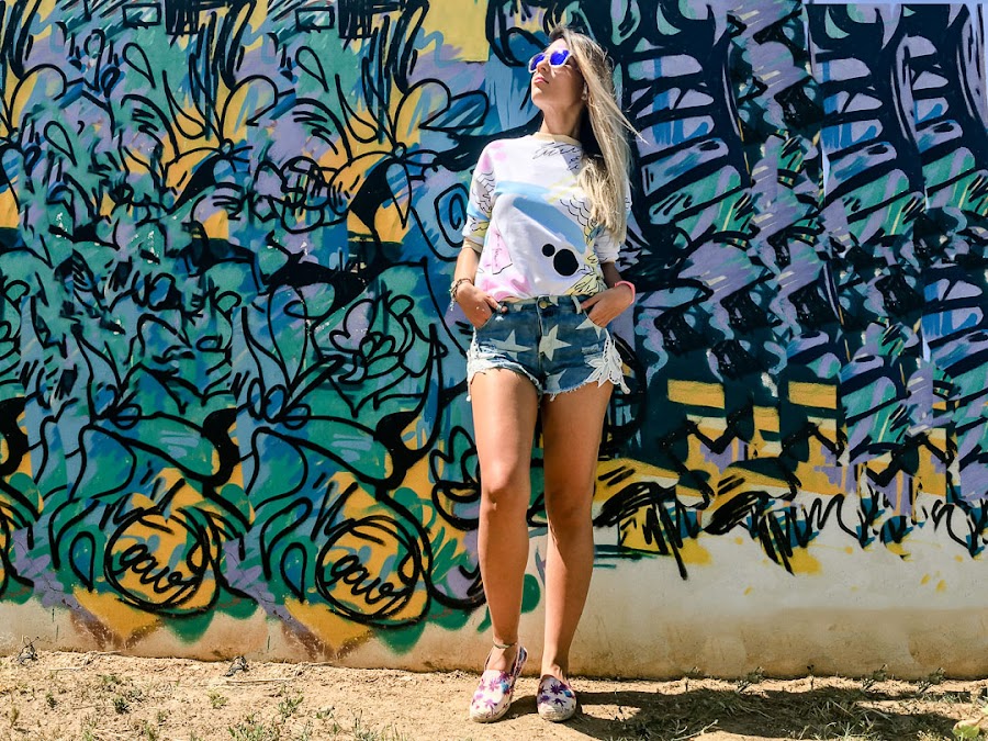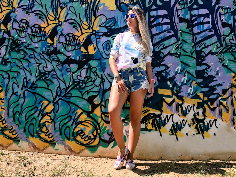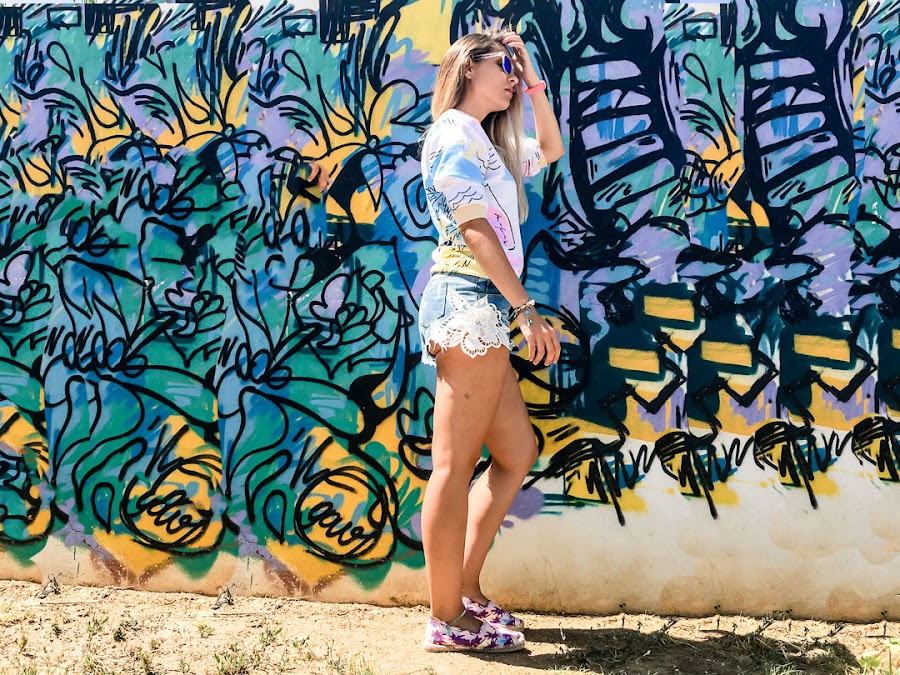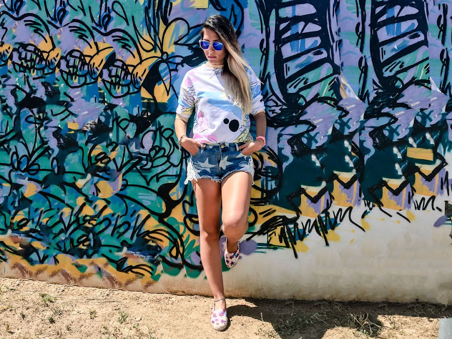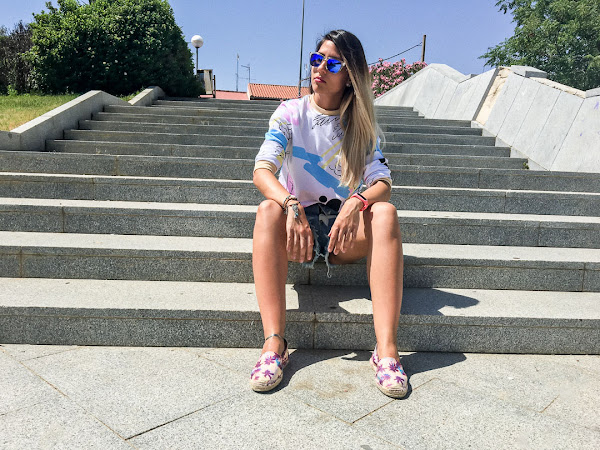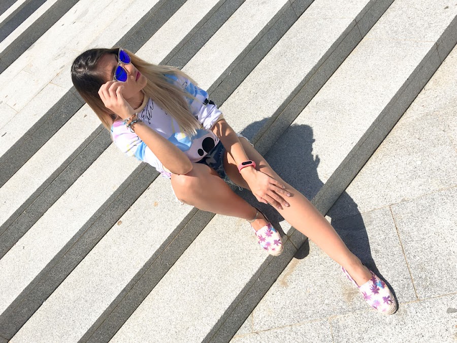 I have combined it with shorts with a star pattern and a white crochet detail on the sides and some tropical print espadriles that you can get in Trendy.