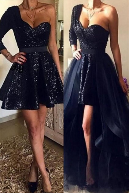 This spectacular black dress fascinates me, although it is short it has a beautiful detachable long skirt in matte fabric, a great contrast with the bright fabric of the dress, as a half-man design is ideal for dancing all night..