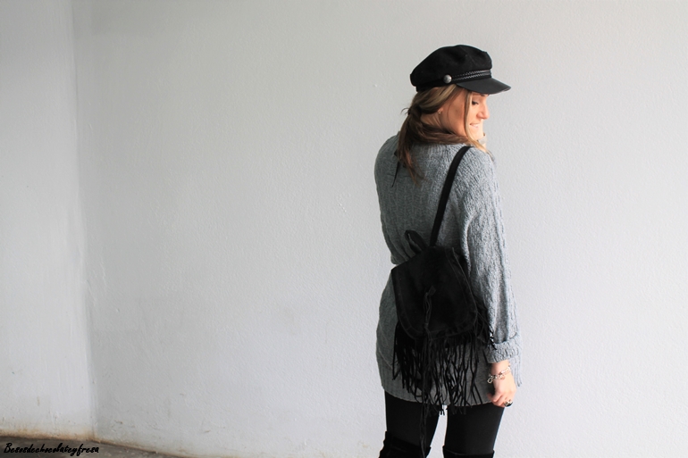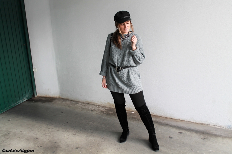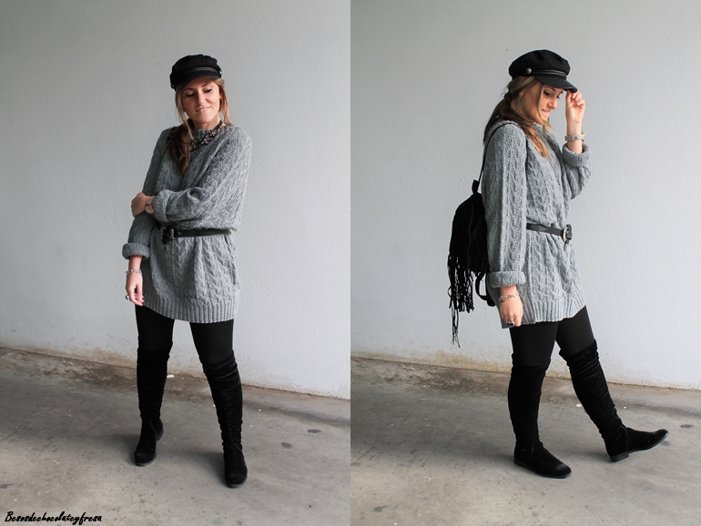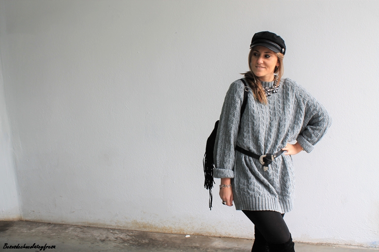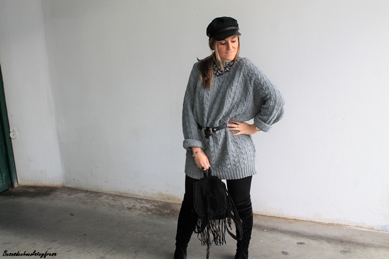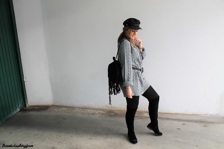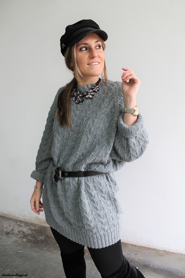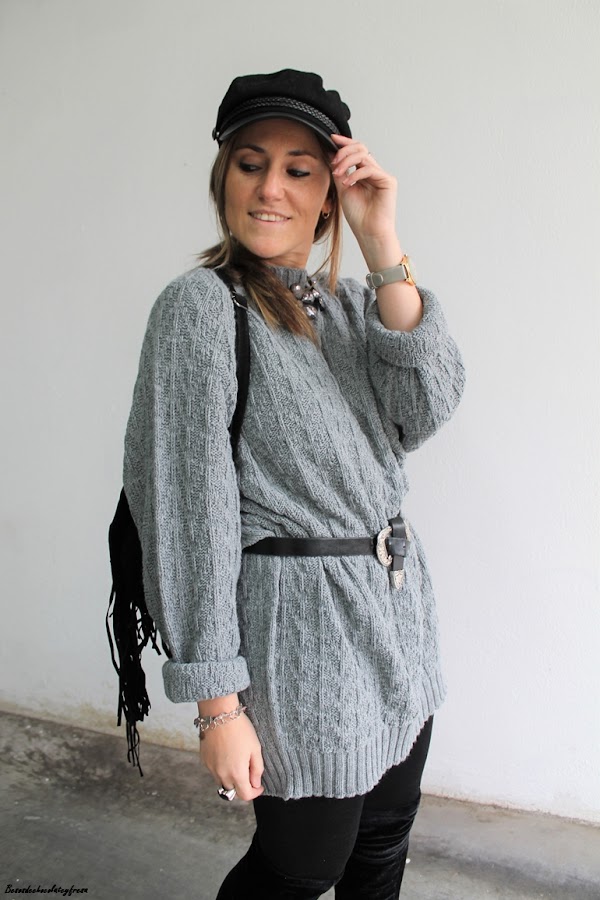 En el look de hoy os muestre¡o este sweater-vestido de punto gordito de ochos en color gris, que combiné con cinturón para marcar un poco más la silueta, aunque suelto doy fe de que queda de vicio también y resulta ante todo cómodo. Complementos en negro completan el look, como gorra marinera, collar de flores, botas de terciopelo y mochila.