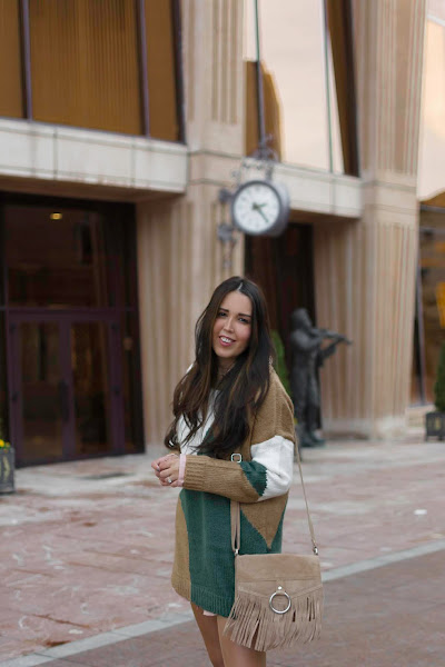 Cuando vi las prendas que componen este look, me enamoraron por completo y las llevé al street style de la mejor forma que se me ocurrió, combinándolas todas. El sweater es súper calentito, algo ancho y con tonos preciosos como el verde botella, el marrón y el blanco, súper combinables. Como es largo, lo utilicé como vestido, aunque sumé una camisa en rosa palo por debajo para conseguir el efecto de bajo camisa. Las botas de corte cowboy ¡son brutales! En un color marrón casi idéntico al del sweater, van hasta la rodilla y tienen el tacón perfecto para sumar centímetros si cansarte. Por último y no menos importante, el bolsito con flecos que le da ese aire boho al look. ¿Qué os parece? También he pensado en combinar el sweater con unos botines y jeans para conseguir un look totalmente diferente y más cómodo. Al final son prendas que pueden darte un montón de opciones.