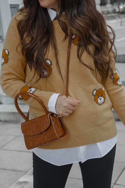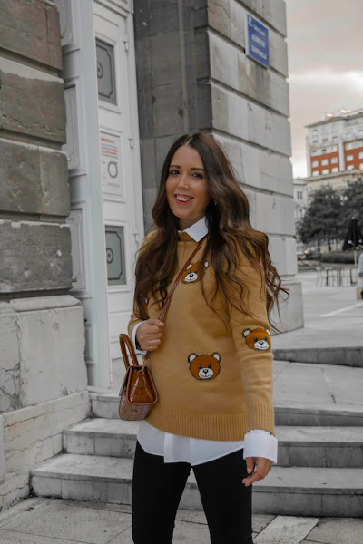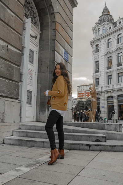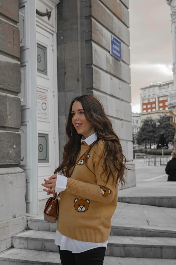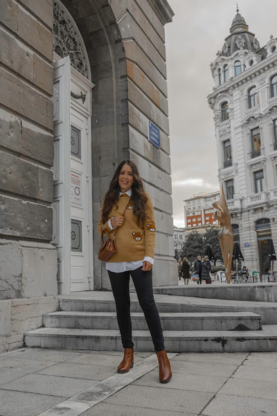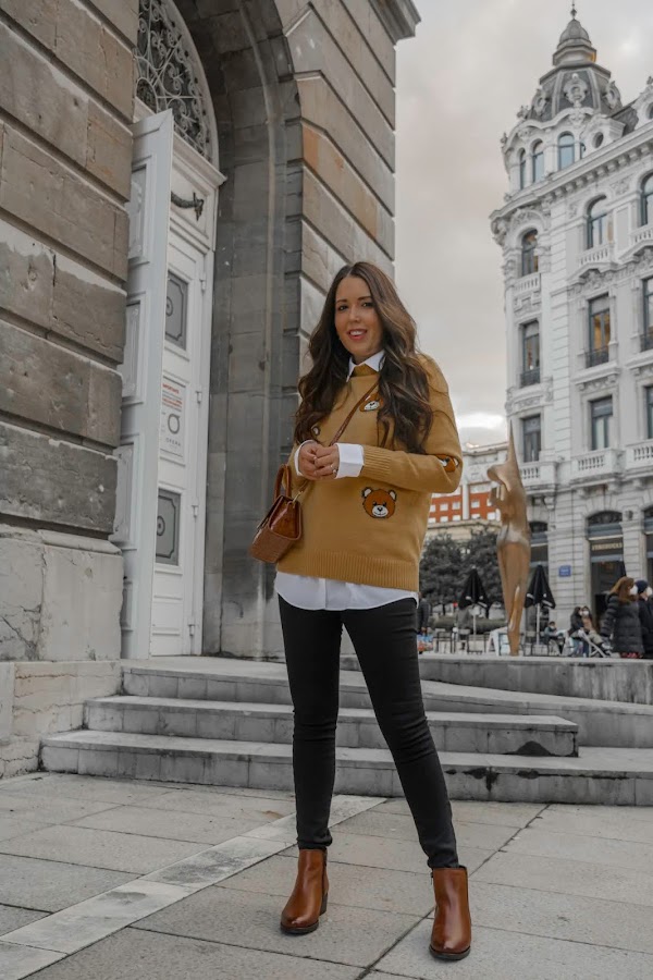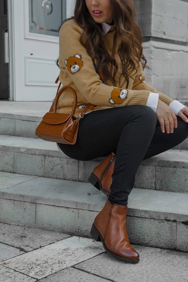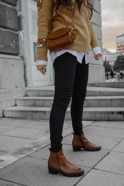 Aquí hace mucho frío, eso sí que no cambia, pero aún así quise desprenderme cinco minutos del abrigo para enseñaros este look, me parece muy divertido a la vez que tiene un toque chic. El jersey es muy cuqui, súper suave y calentito, además los ositos le dan un toque dulce. Cuando lo vi fue amor a primera vista y la verdad, me recordó mucho a los tan conocidos diseños de Moschino. El bolsito me pareció súper chulo para poder combinarlo con los botines que no pueden ser más cómodos. Me encantan este tipo de botines, son los típicos que puedes ponerte horas, caminar kilómetros y no cansarte, además de que son súper calentitos y suaves. Tienen un color marrón precioso y es un básico de fondo de armario que podemos combinar tanto con jeans pitillo, jeans más anchos o bien una falda. Son de Pepe Menargues, una marca especializada en la fabricación de calzado de piel elegante a la par que cómodo y de calidad. Se elaboran de forma artesanal desde 1957 en Elche y sus colecciones están desarrolladas con materias primas de alta calidad, podéis ver toda la información en su Web.