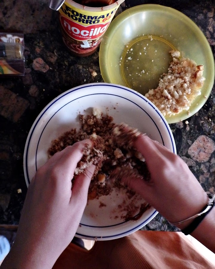 A continuación vamos a mezclar la nocilla con las magdalenas deshechas, no hay que hacerlo de golpe, sino poco a poco, echamos unas miguitas y un poco de nocilla, y así hasta que nos salga una masa homogénea. No hay cantidades exactas, se va haciendo a ojo hasta que consigamos la masa deseada,