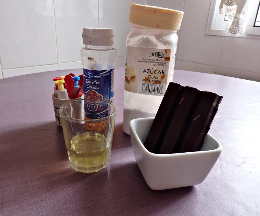 Ahora toca decorar, en mi caso he utilizado chocolate fundido, glaseado ( click aquí para ver la receta), gominolas (que no salen en la foto) y estrellitas de azucar.