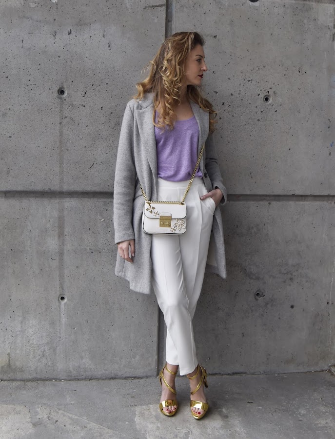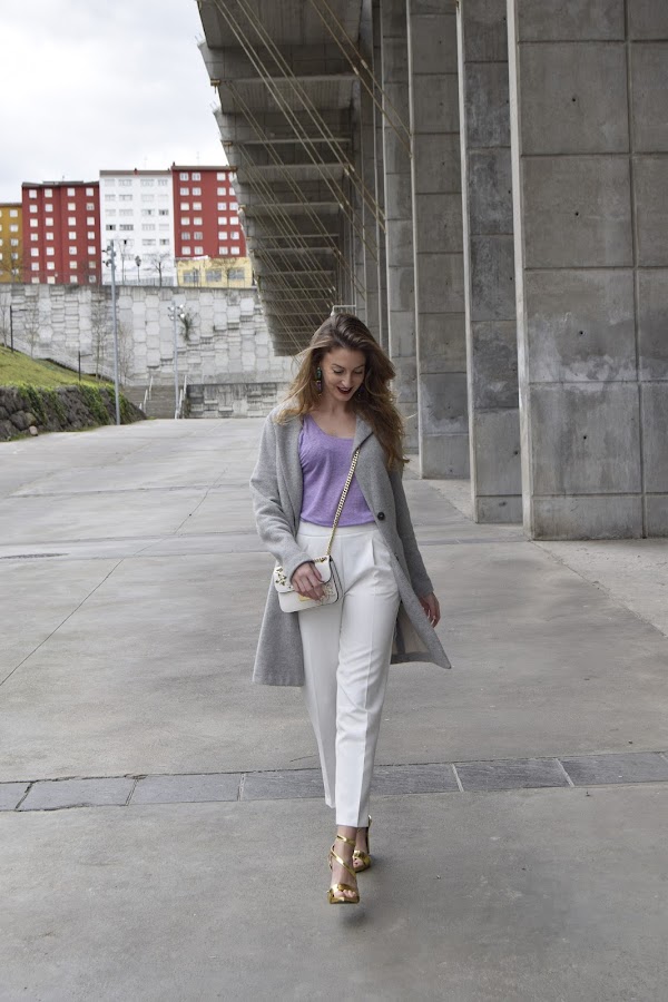 Uno de los tonos que mejor combina con el color lavanda es el blanco, especialmente en conjuntos frescos y primaverales. El gris es otro de los compañeros ideales para este tipo de malva, siguiendo esta tendencia y para dar protagonismo a la camiseta lo combiné con blanco y gris.