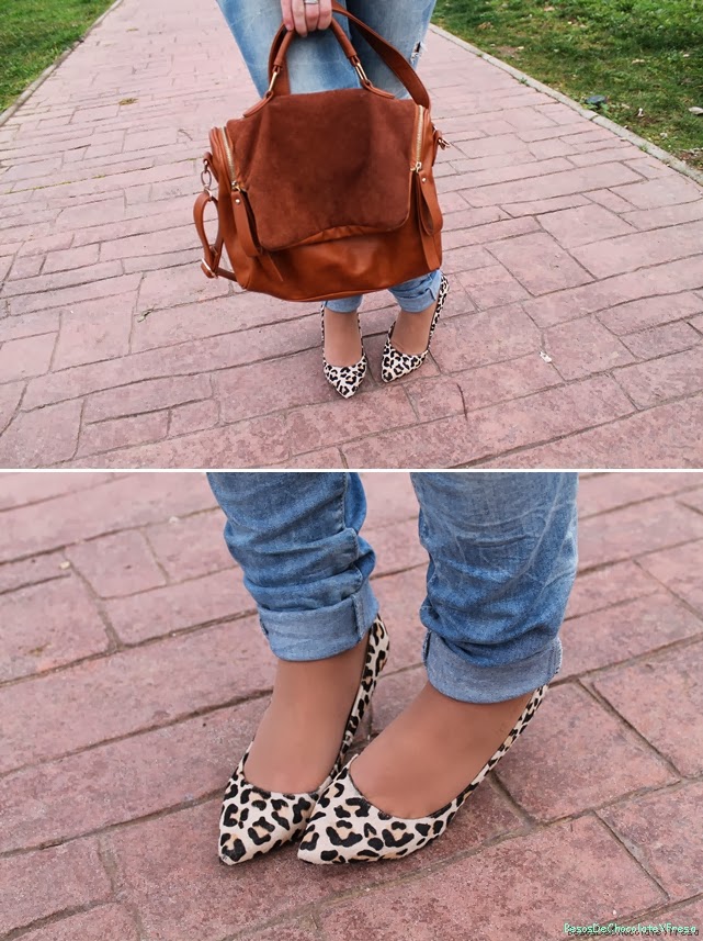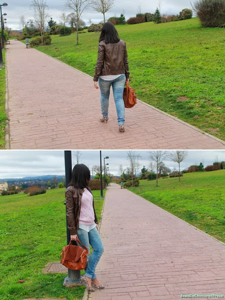 As for today"s post I show you a sweet look with pastel colors, so fashionable this season and the next to arrive. I combined eight rosita sweater and jewel-neck white shirt, ripped jeans and leather jacket in brown. As supplements animal print shoes, shoulder bag in brown leather and suede and watch coppery color.
