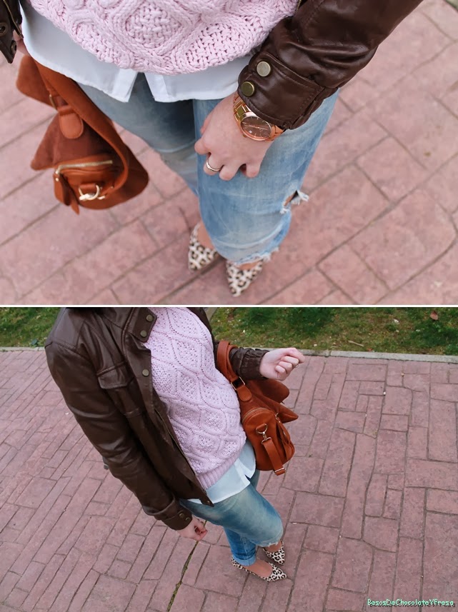 En cuanto al post de hoy os enseño un look muy dulce con tonos pastel, tan de moda esta temporada y la próxima en llegar. Combiné sweater de ochos rosita y camisa cuello joya en blanco, ripped jeans y cazadora de cuero en marrón. Como complementos zapatos animal print, bolso bandolera en marrón de piel y ante y reloj color cobrizo.