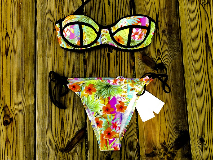 Y yo os enseño el bikini que he elegido, un bandeau de aros con filo negro y un estampado tropical y bragas brasileñas de lazo a juego. Me encantan los bikinis coloridos, sobre todo por lo genial que sientan cuando estamos morenitas y en cuanto vi este diseño, supe que este bikini tenía que ser mío!