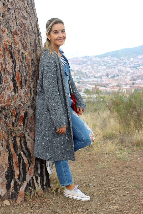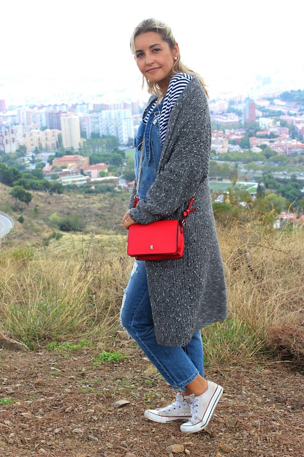 En el look de hoy, llevo mi peto tejano que es super cómodo y lo combiné con una camiseta de rayas. Como hacía un poco de frío, decidí añadirle una chaqueta larga de punto de color gris. Los accesorios que escogí fueron mis Converse y un bolsito rojo.