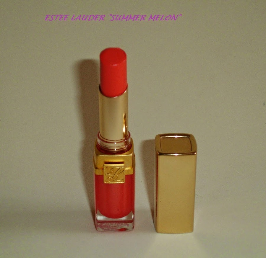 Me resulta imposible decantarme sólo por uno, pero haciendo un gran esfuerzo de síntesis voy a nombraros dos labiales que me encantan y que además estoy usando muchísimo en las últimas semanas, por una parte está el "Summer Melon" de Estee Lauder, un tono naranja con chispitas, veraniego donde los haya y también muy cremoso: