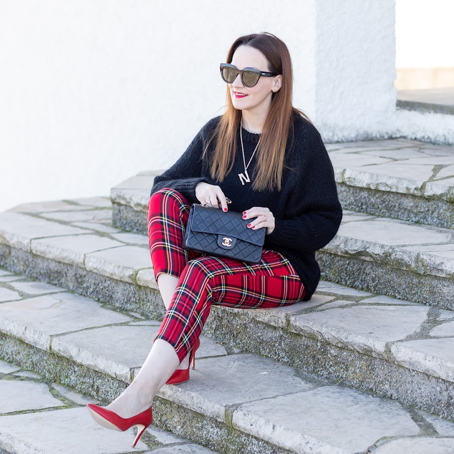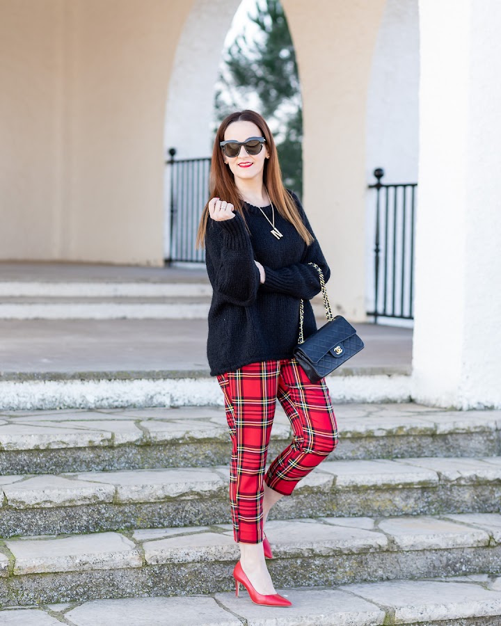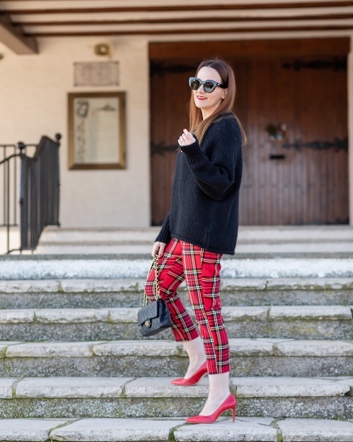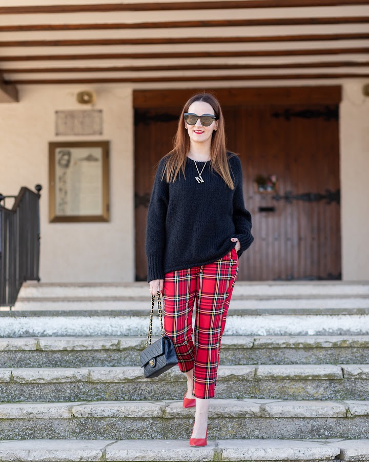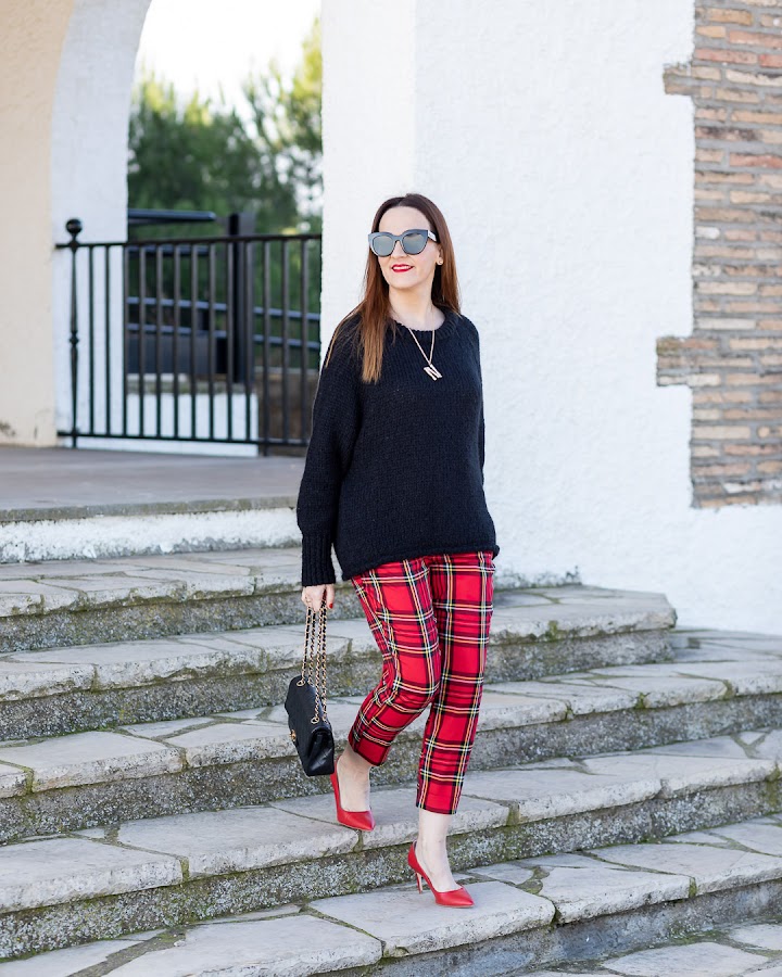 Como cada Navidad, los amigos nos juntamos para hacer una comida en la que no falta nadie, ya que para los días festivos es más difícil que todos podamos coincidir. Este día me encanta, además, aprovechamos y celebramos el "amigo invisible" con el que nos echamos siempre unas risas. Este es el look que llevé para ese día, como ya sabéis el estampado tartan me chifla, por lo que opté por estrenar los pantalones con tartan en rojo que combiné con jersey de punto negro, zapatos rojos y mi bolso favorito.