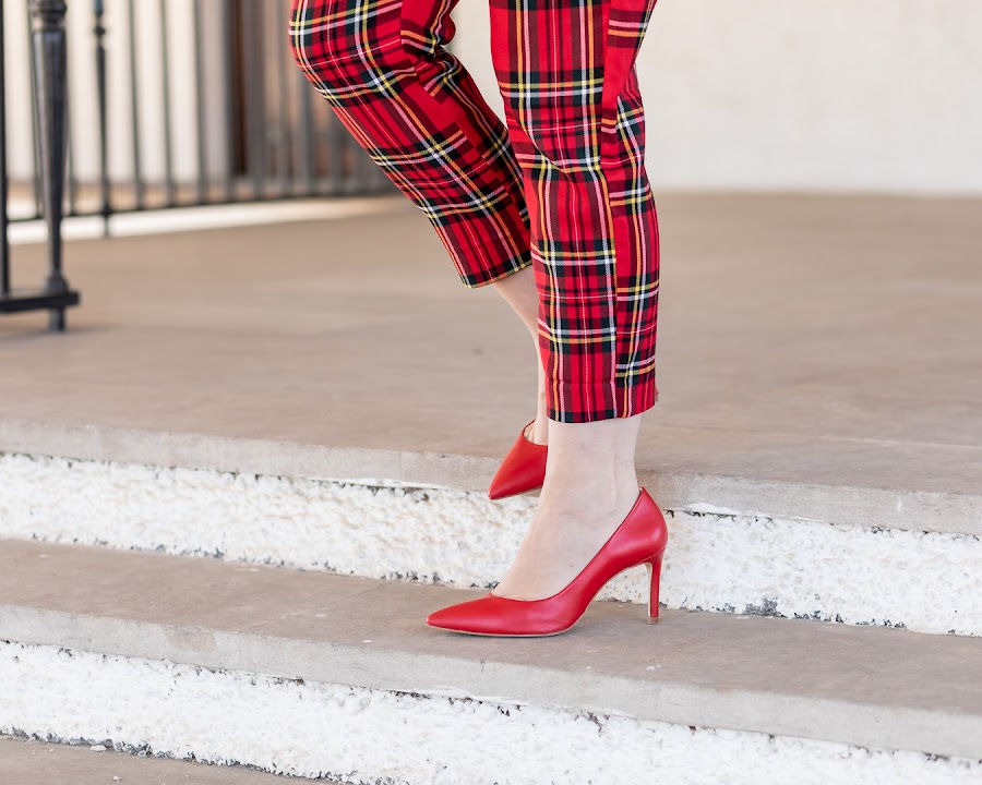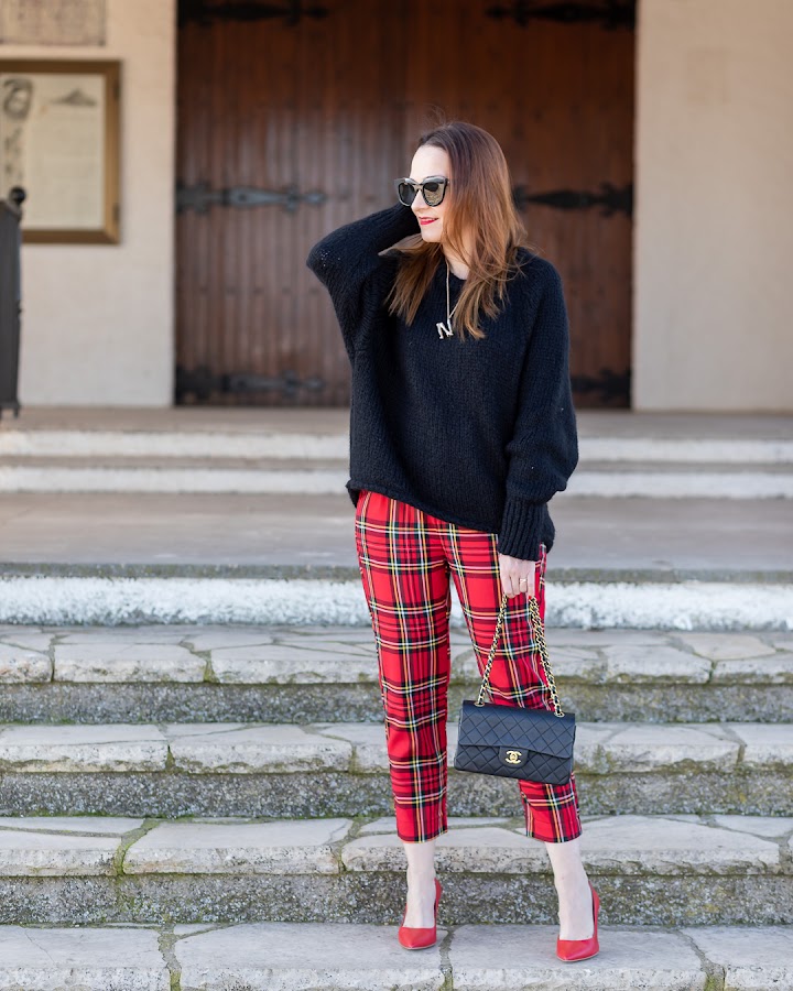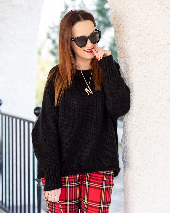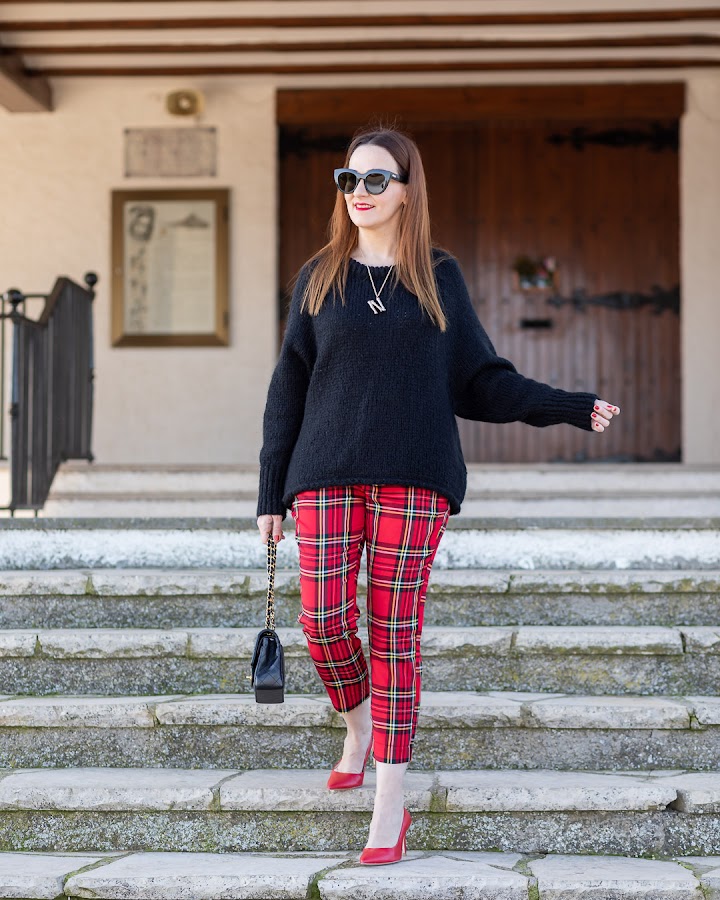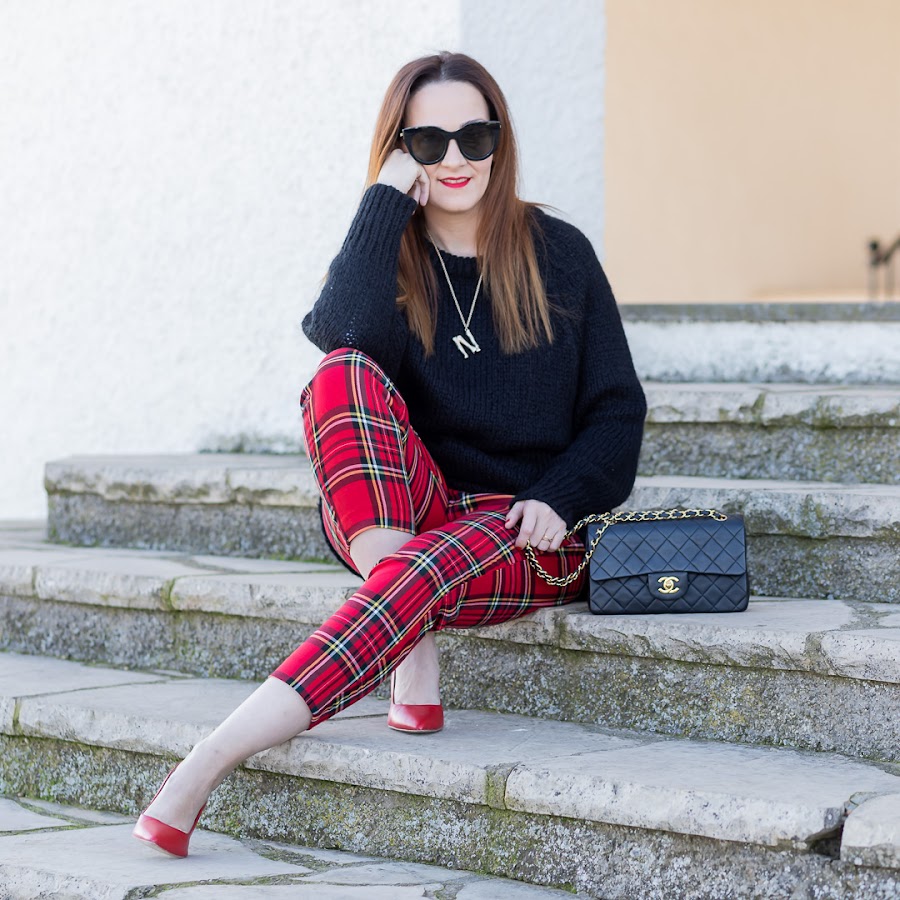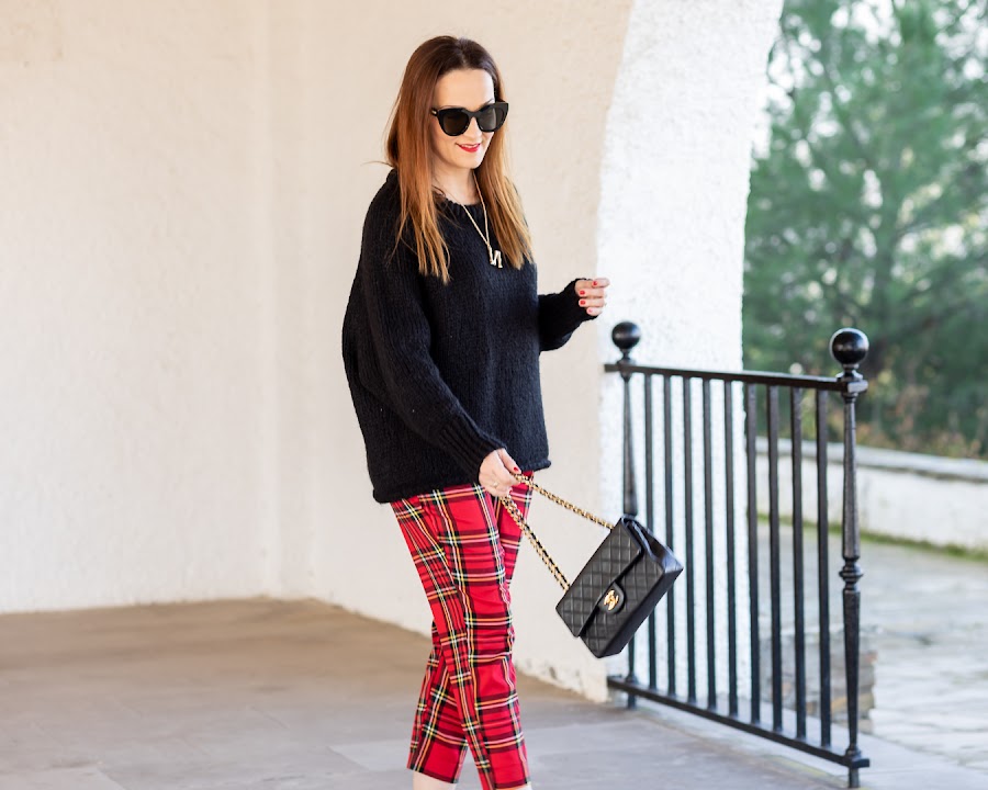 Como cada Navidad, los amigos nos juntamos para hacer una comida en la que no falta nadie, ya que para los días festivos es más difícil que todos podamos coincidir. Este día me encanta, además, aprovechamos y celebramos el "amigo invisible" con el que nos echamos siempre unas risas. Este es el look que llevé para ese día, como ya sabéis el estampado tartan me chifla, por lo que opté por estrenar los pantalones con tartan en rojo que combiné con jersey de punto negro, zapatos rojos y mi bolso favorito.