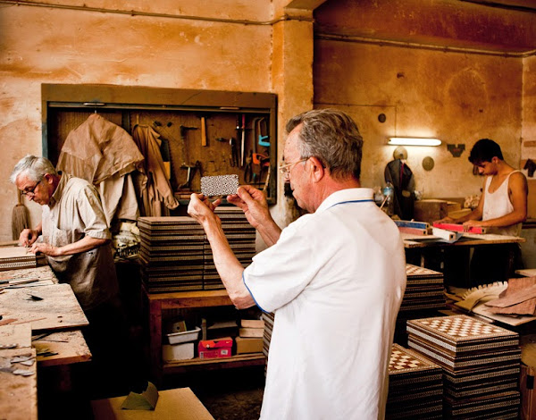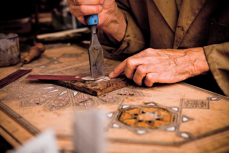 Originaria del árabe andalusí, sólo existen dos ciudades en el mundo -Granada y Damasco- donde todavía perduran la pureza y el estilo primogénito de este proceso, que ha sobrevivido gracias al esfuerzo generacional de familias artesanas. A partir de materiales nobles, estos profesionales de la paciencia y la minuciosidad trabajan la técnica de engarzar individualmente miles de piezas únicas, con las que van creando composiciones geométricas de irrepetible manufactura, cuya incrustación y posterior lijado y barnizado, dan lugar a complejos y bellos mosaicos.