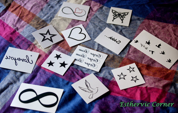 Esto es lo que me llegó, me dieron la opción de elegir los diseños y me volví loca. La web se divide en distintas categorías, dandote hasta la opción de diseñar tu propio tatuaje. Asi si quieres hacerte uno pero no sabes como te quedaria, mejor probarlo antes con uno que se vaya a poder quitar facilmente.