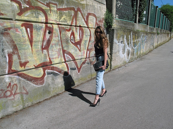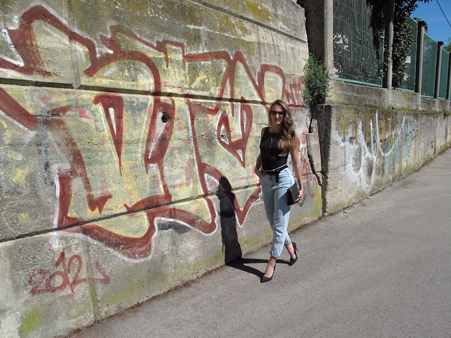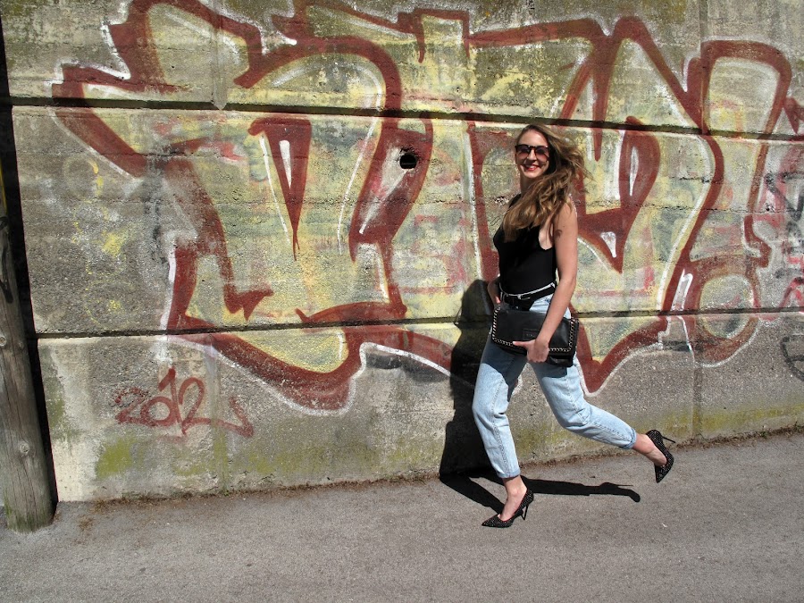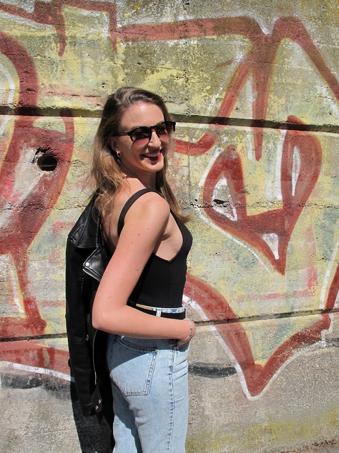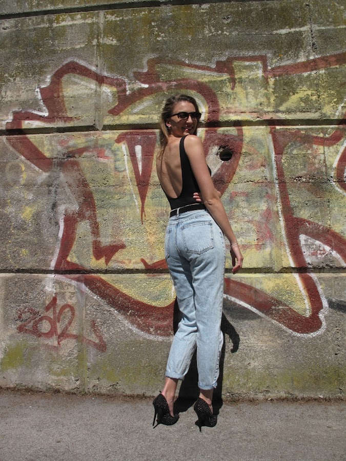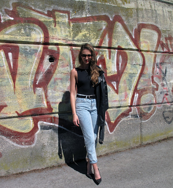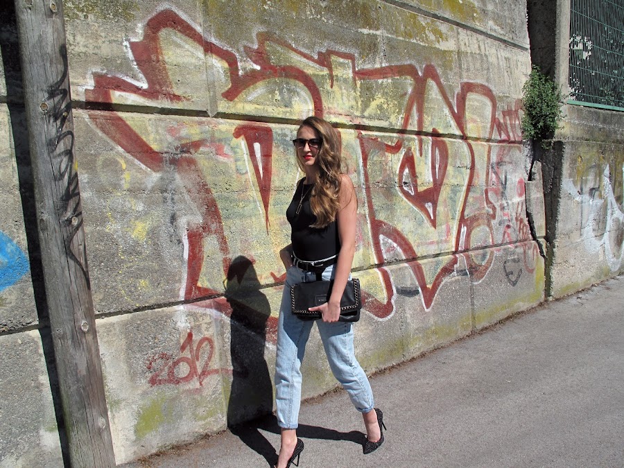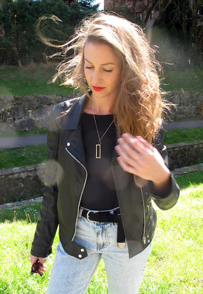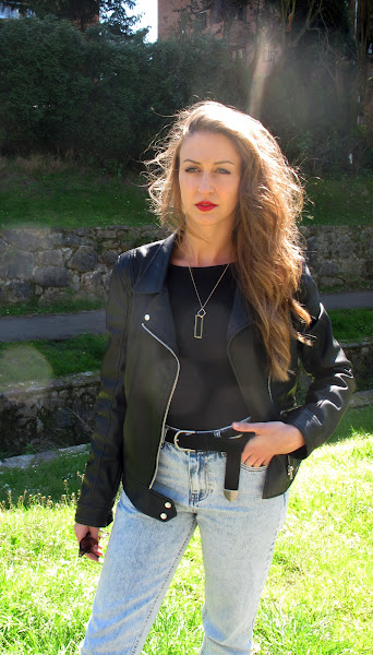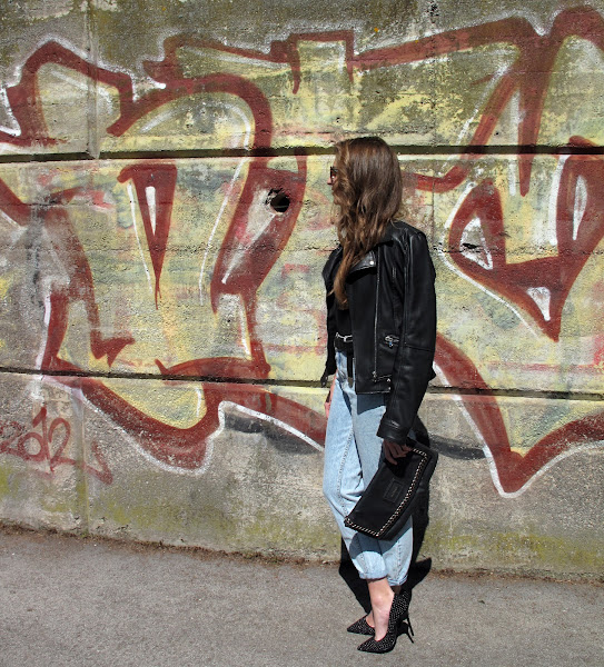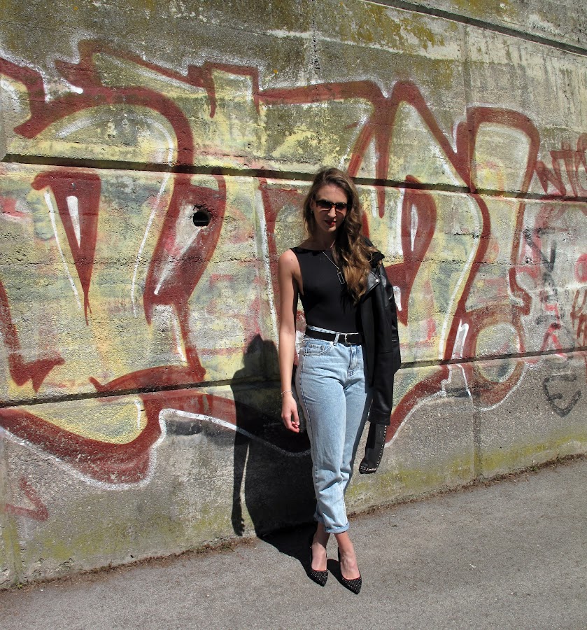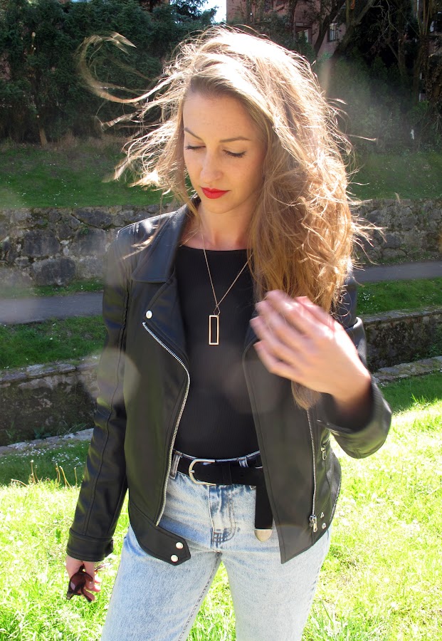Body + oversized jeans +cazadora de cuero +stilettos