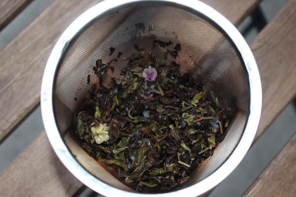 Este Oolong está aromatizado con flor de Asia y por eso se ven algunos pequeños capullos de rosa. Así queda la infusión una vez pasado el tiempo de reposo (2-3 minutos a 80º).