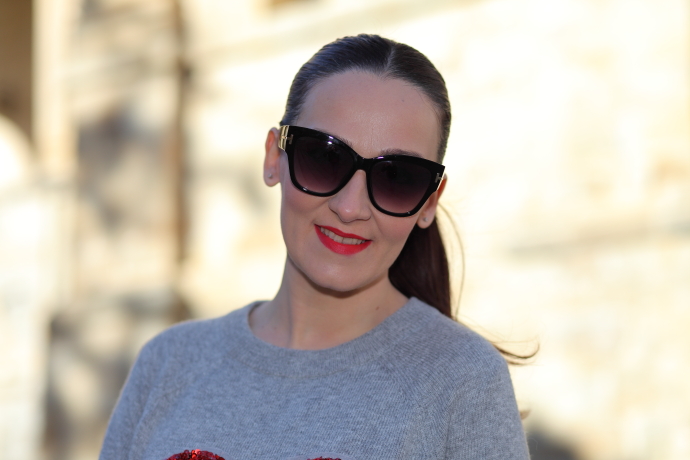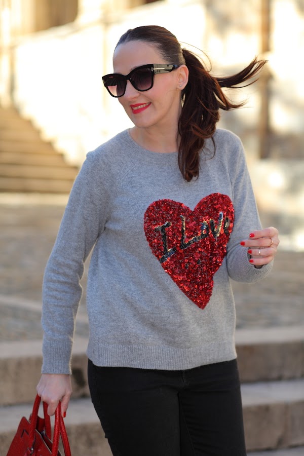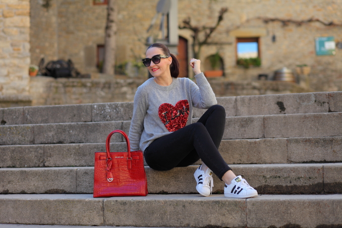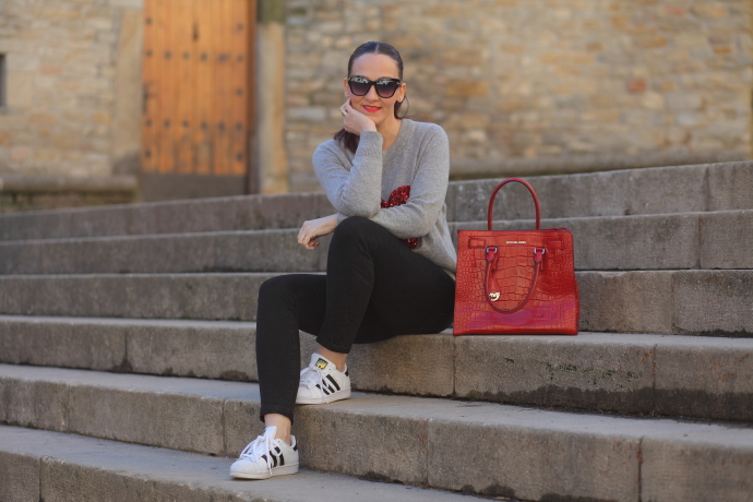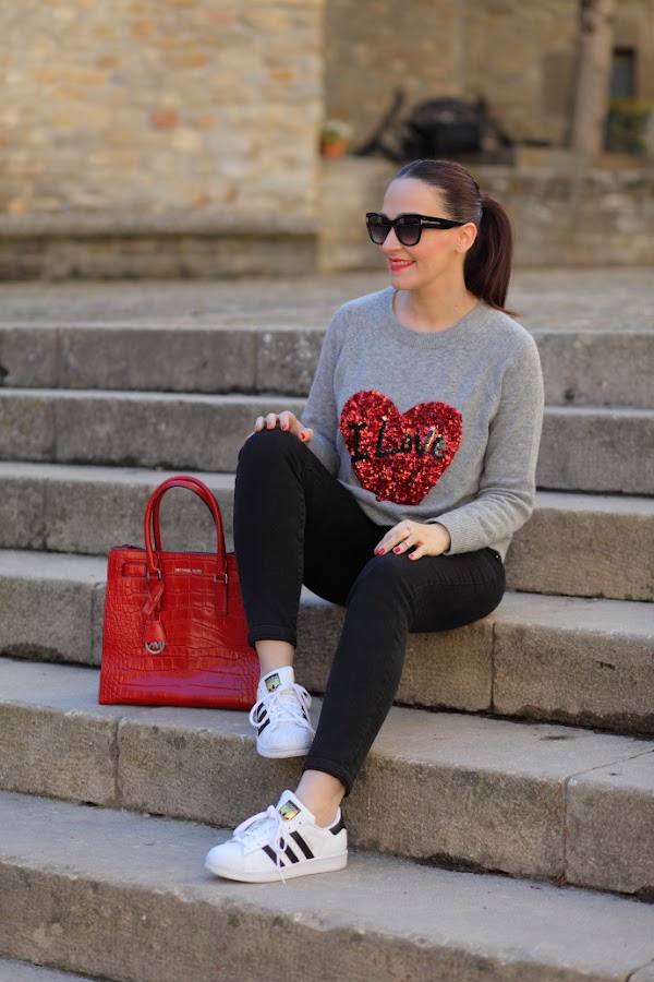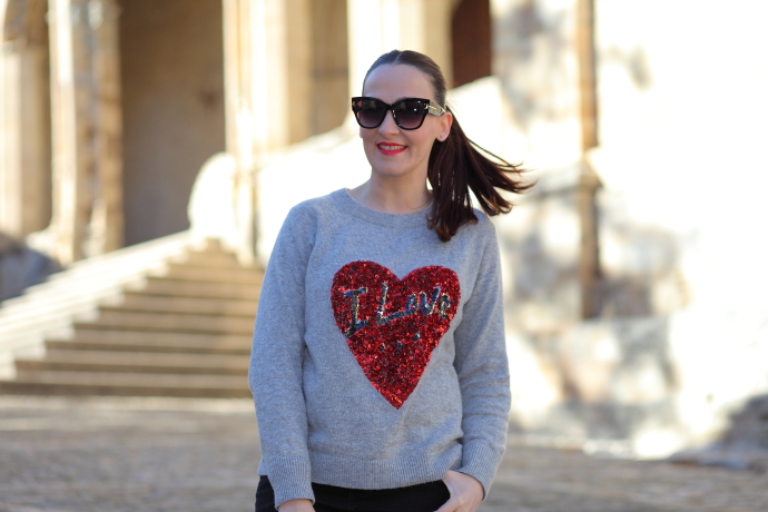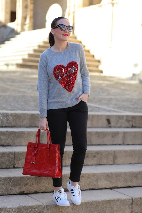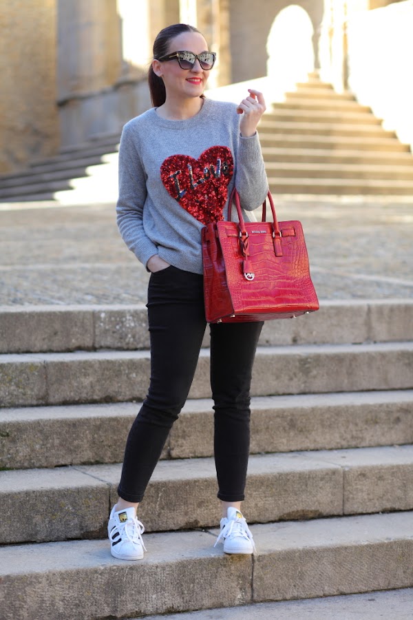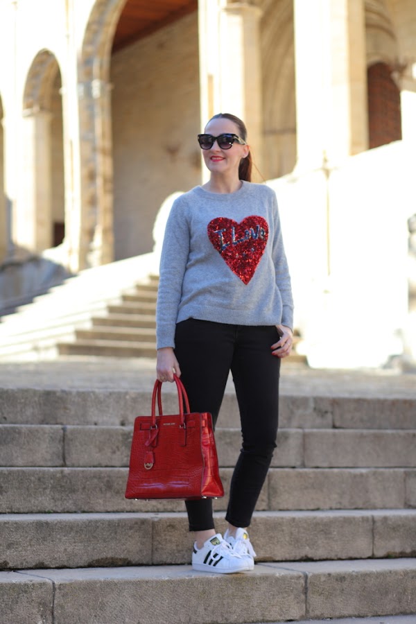 Nada mejor que un look sporty chic con mis queridas Adidas Superstar para disfrutar de un día de turismo. Como hacía bastante frío me decanté por ponerme uno de mis jerséis preferidos de este invierno, además de calentito me chifla el detalle del corazón de lentejuelas. Lo combiné con unos jeans tobilleros negros y uno de mis bolsos preferidos.