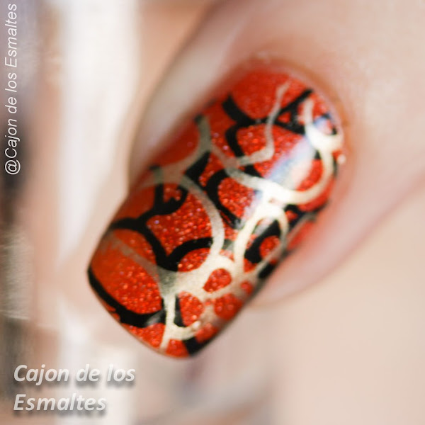 Después de unos días de descanso vuelvo a mi técnica favorita: el estampado de uñas. Y estrenando placa de la marca HeHe (la nro 40) que conseguí de la tienda de nail art Lady Queen y técnica nueva. Nunca había probado el doble estampado, consiste en estampar dos veces el mismo diseño con distintos colores y ligeramente desfasado. Por esas cosas del destino tenía un esmalte naranja puesto (porque no solo en Halloween se usan!) y terminé con las uñas medio disfrazadas de jirafa luego de estampar con negro y dorado.