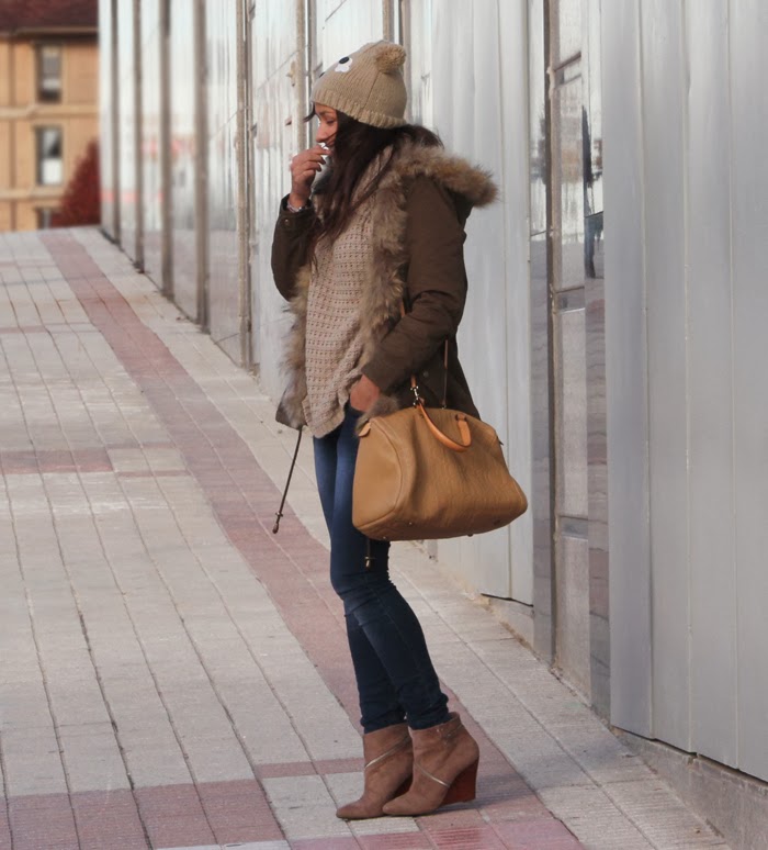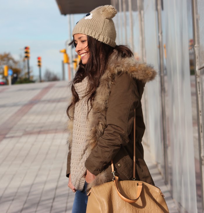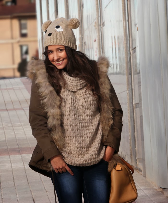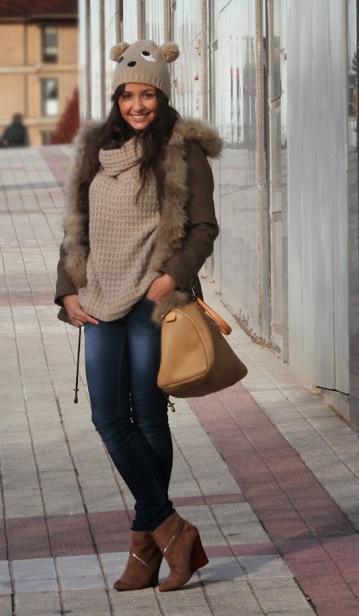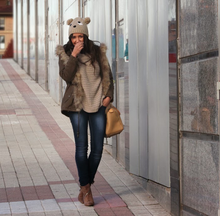 El protagonista indiscutible es el gorrito con forma de oso, lo tengo desde hace ya un par de años. Recuerdo la primera vez que me lo puse, la gente me miraba de forma rara... por suerte ahora se han convertido en una plaga y ya nadie se extraña. También llevo los botines de Just Fab que son comodisímos y gracias a su color van con todo. El resto de prendas ya las conocéis ;)