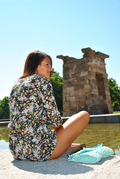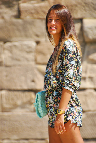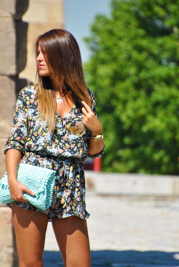 Para este día elegí un mono corto con estampado de flores, escote de pico y manga semicorta combinado con sandalias planas color camel y clutch de rafia turquesa. Los monos son una de las prendas más ideales para los días de más calor, son cómodos y frescos, así que si aún no tenéis alguno haceros con uno este veranito.
