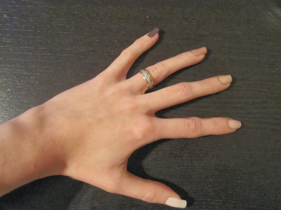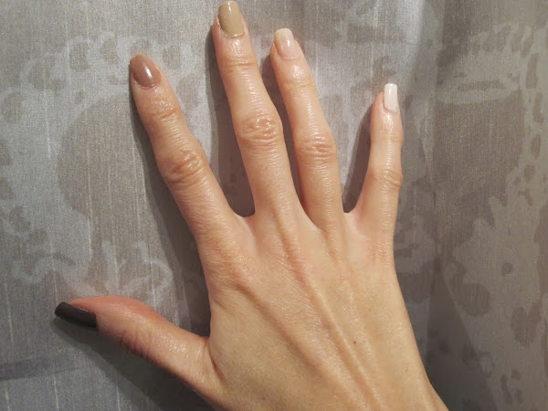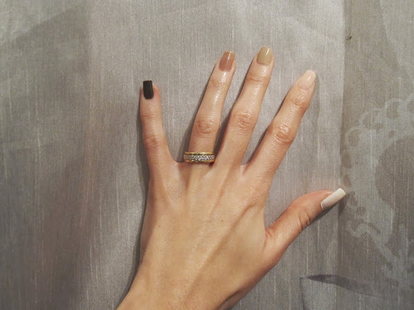 Como me las he pintado?empezando del tono mas claro al mas oscuro, en la mano izquierda, el color mas claro en el pulgar y el mas oscuro en el menique y al contrario en la mano derecha, como os muestro en las fotos. De manera que al unir mis manos quede el tono medio ( DON"T PRETZEL MY BUTTONS ) en el dedo corazón en ambas manos.