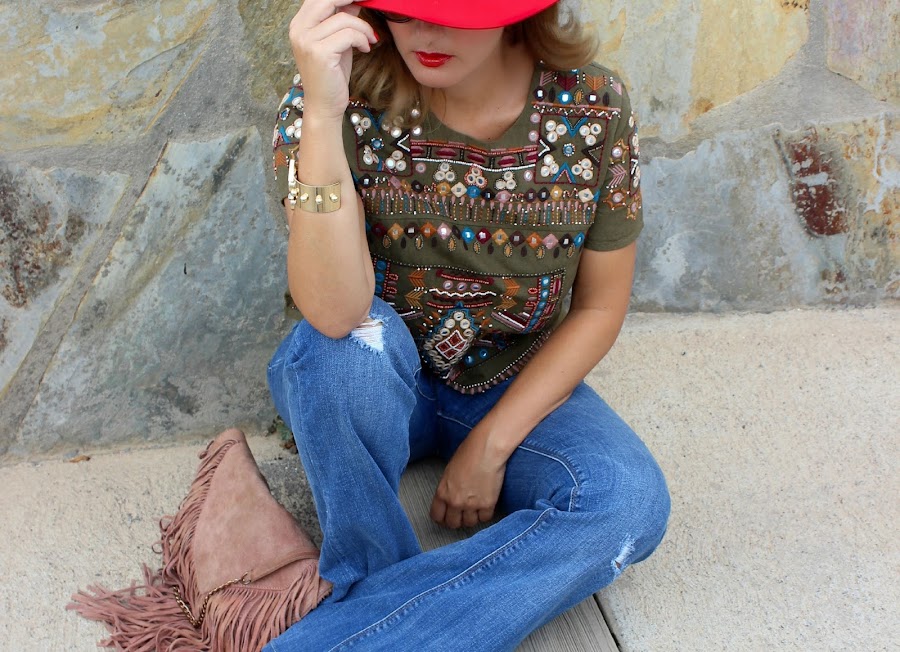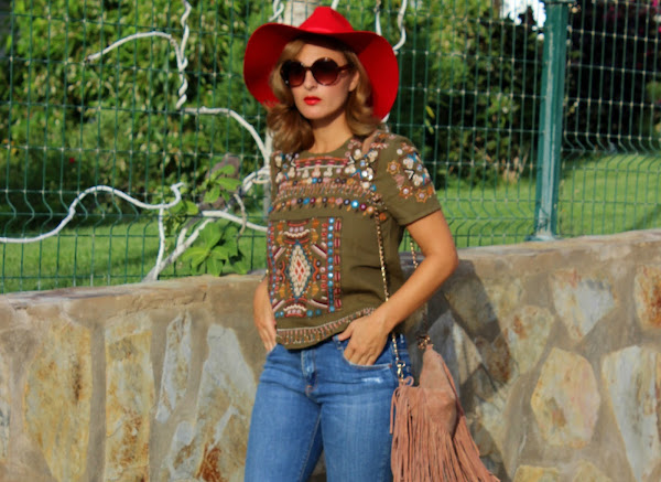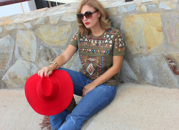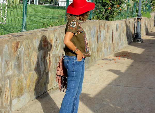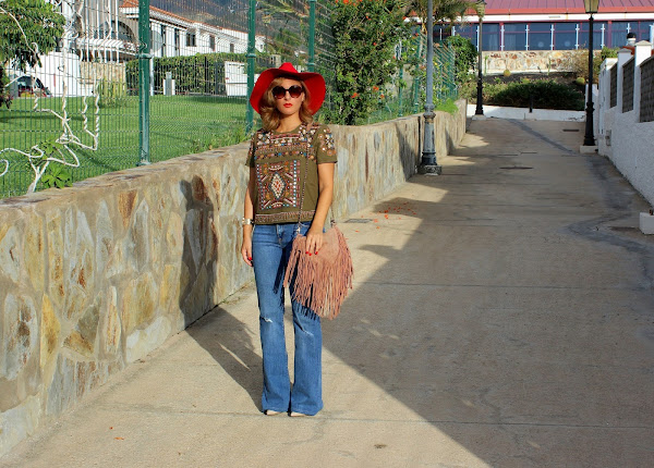 El pasado Lunes tuve una reunión de padres en el cole y después una merienda con amigas, pensé- " qué me pongo que me vaya genial para las dos citas" y este ha sido el resultado, un sombrero rojo con ala grande, un bolso mediano con flecos y unos jeans acampanados marcando una silueta setentera que encaja a la perfección con la camisa étnica. No sé a ustedes pero a mi me encantó el resultado.