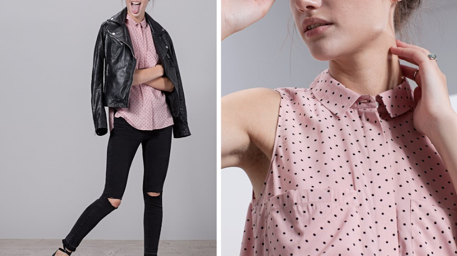 Esta camisa, de la misma marca Stradivarius es súper combinable en estos cambios de temporada, que ni frio ni calor, ya que es de manga a la sisa y combina un color muy pastel con estampado de puntos y tiene un precio bastante económico (7.95€) ya que está rebajada.