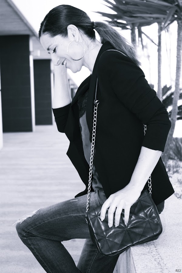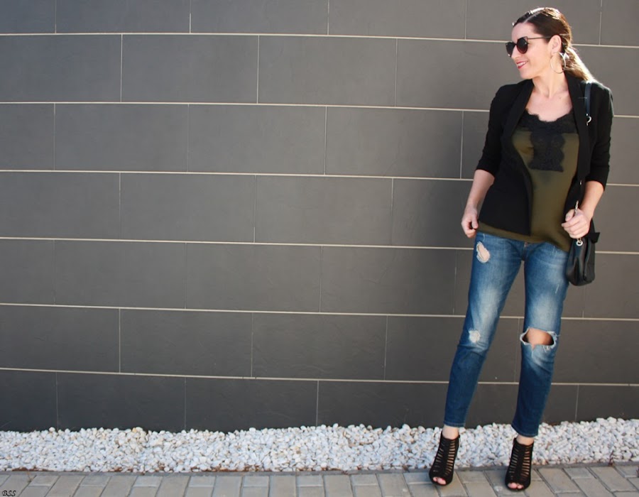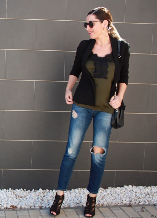 Un top en seda y encaje con blazer tipo smoking suman a un look con jeans rotos que tanto me gustan. Un toque definitivo a un outfits sencillo y a la vez perfecto para el día día.