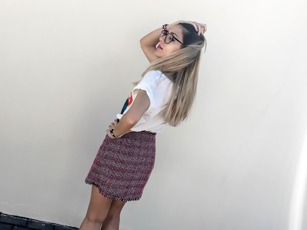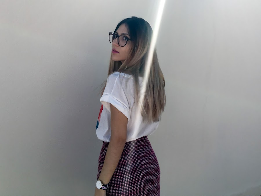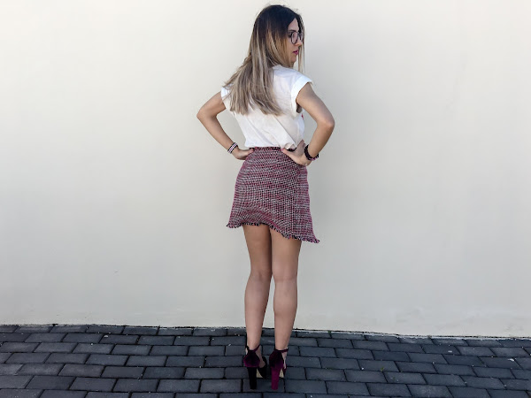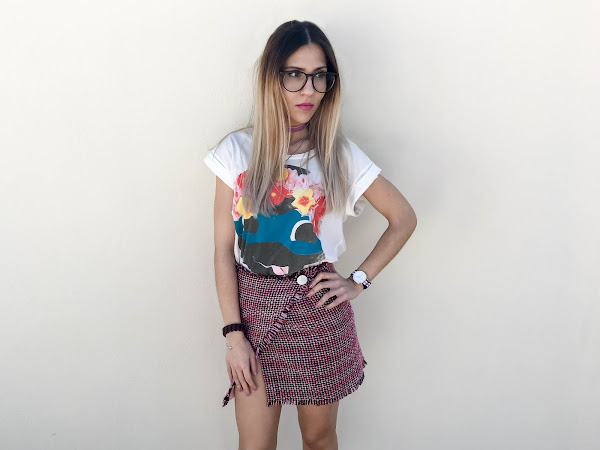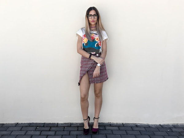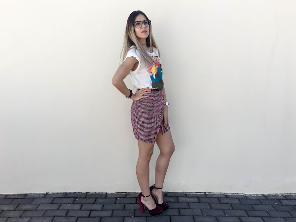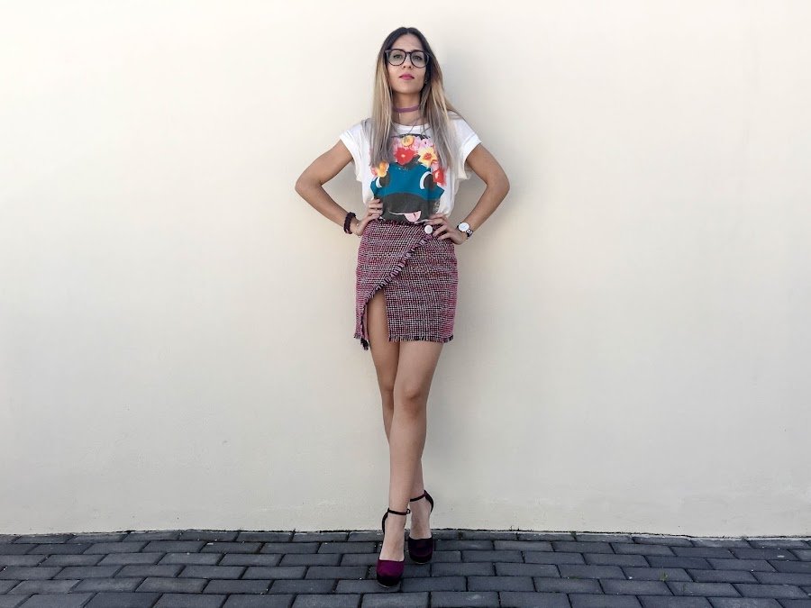 En cuanto a la falda, me ha encantado, es cruzada y se abrocha mediante un botón lateral. La he combinado con mi camiseta estampada de DEAR TEE y unos súper taconazos de terciopelo de JUSTFAB.