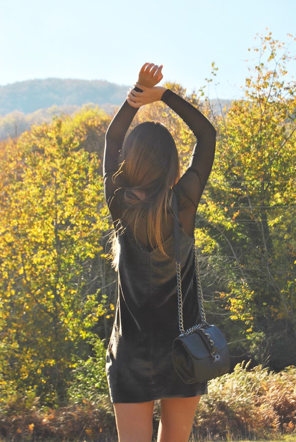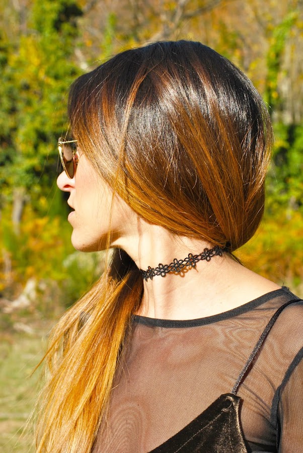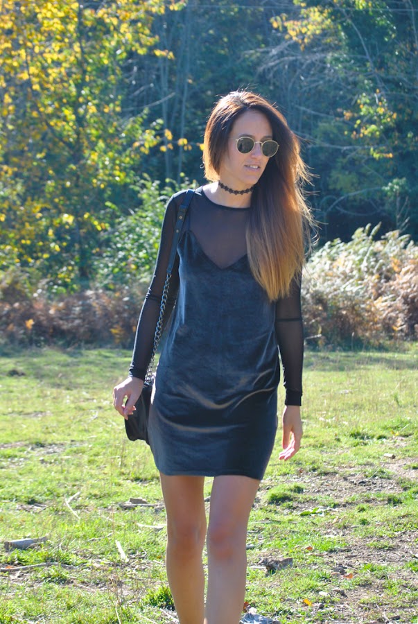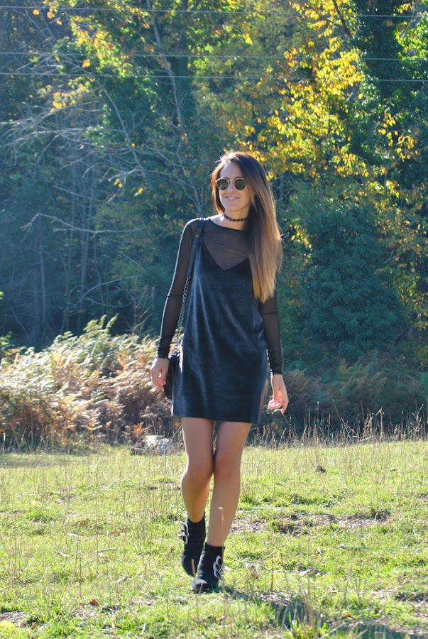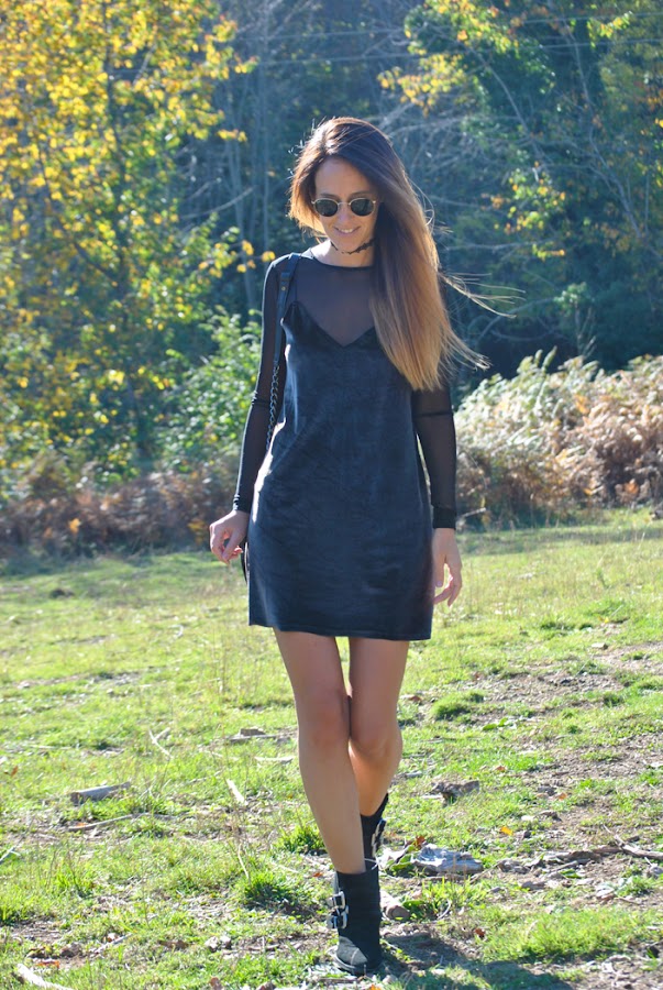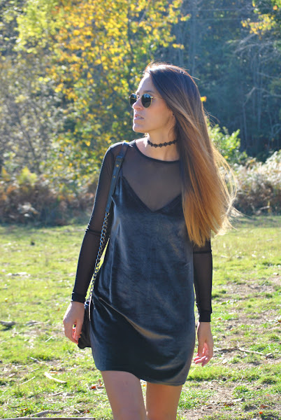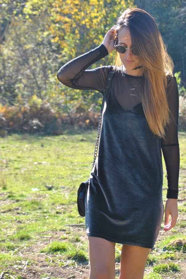 ¡Buenas noches a tod@s! En el post de hoy os traigo un outfit otoñal que reúne varias de las tendencias de esta temporada. El look está compuesto por un mini vestido de terciopelo verde superpuesto sobre una camiseta de tul negra y lleva como complemento el chocker, el accesorio indispensable del momento. Como sabéis este año están mas de moda que nunca los noventa así que espero que os sirva de inspiración.