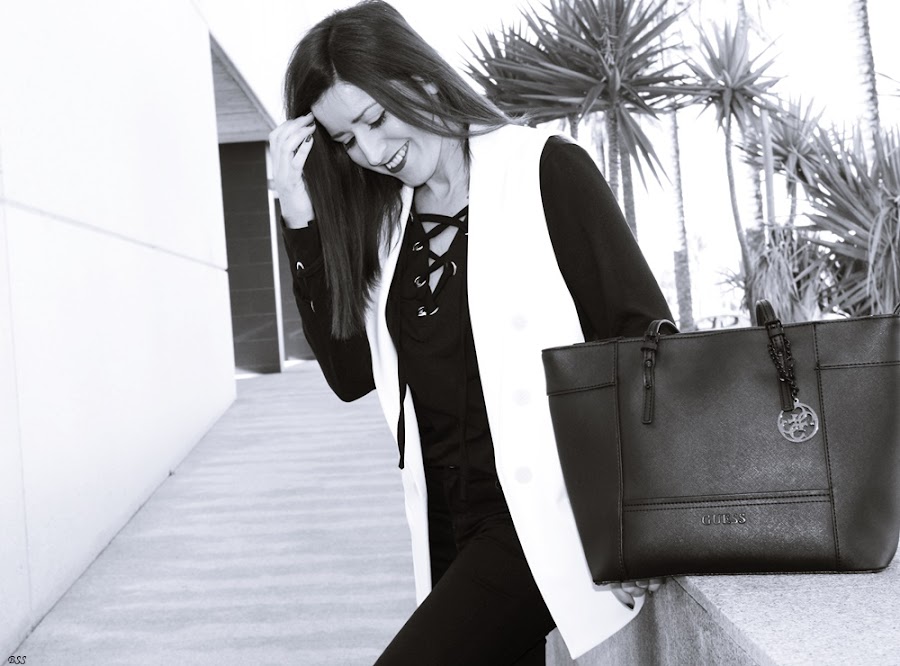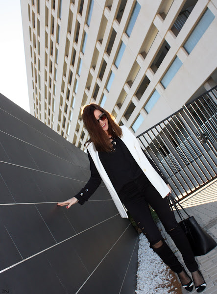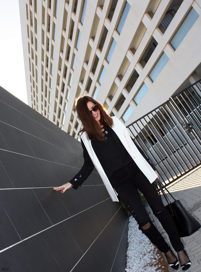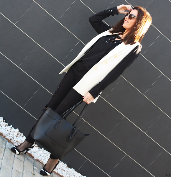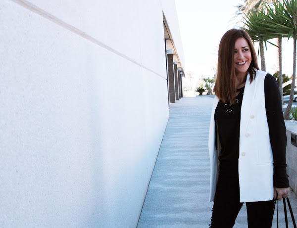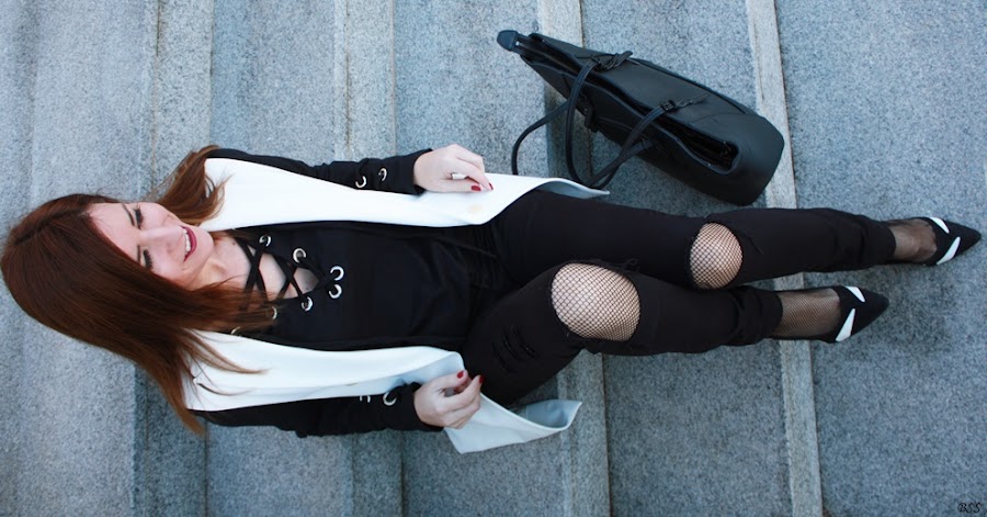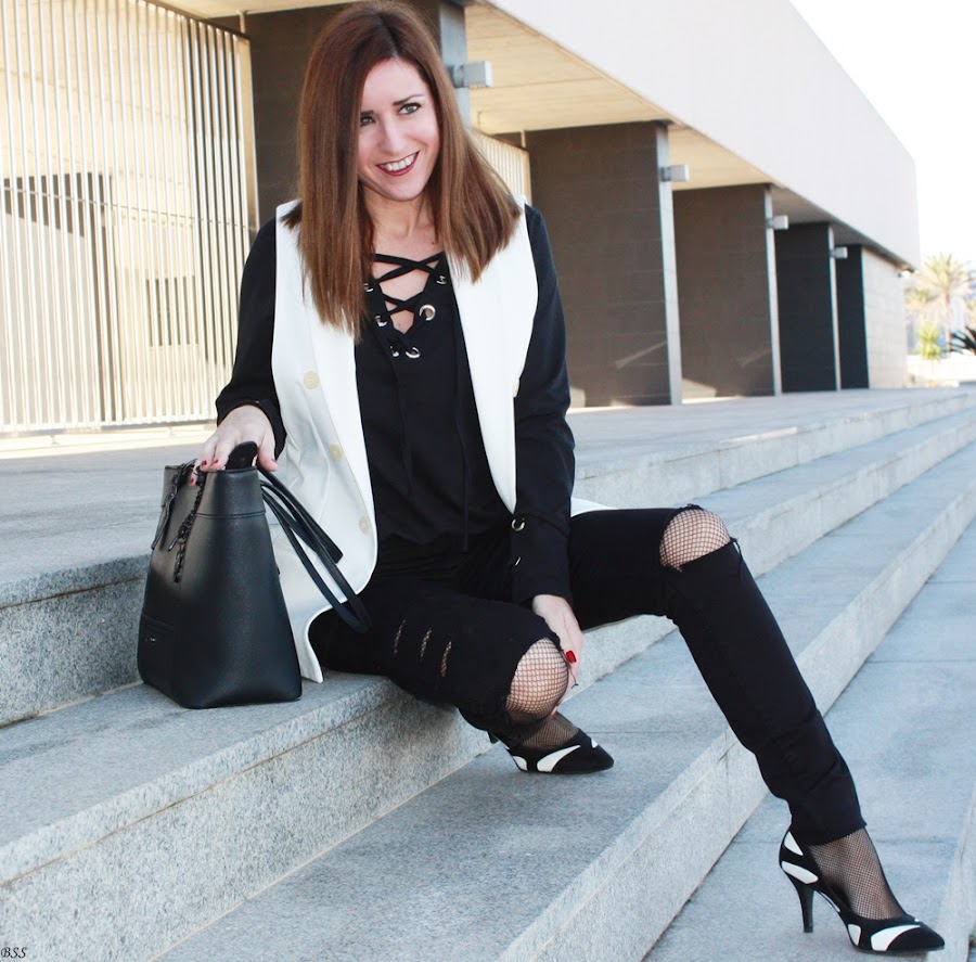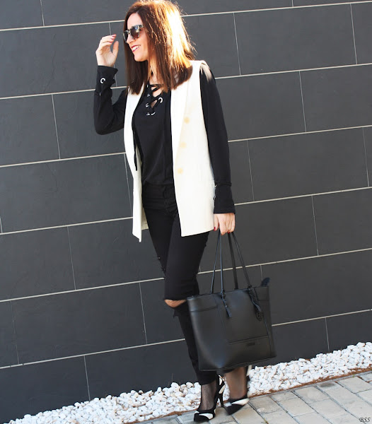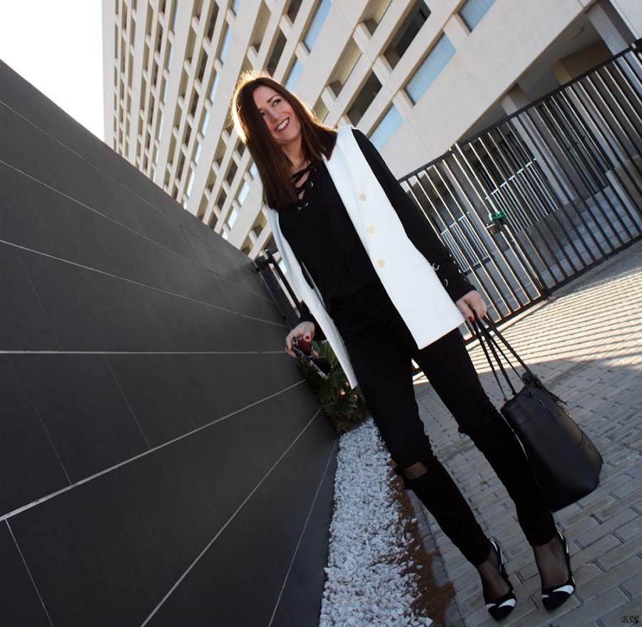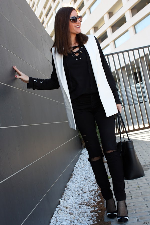 Hoy en mi propuesta las anillas y los lazos cobran importancia en un outfit sencillo en total black donde el chaleco en blanco rompe la sobriedad del mismo.