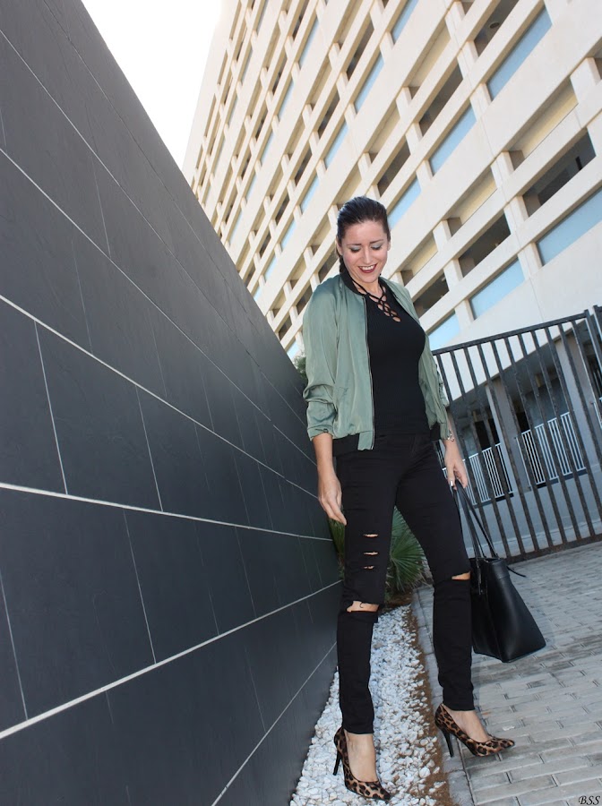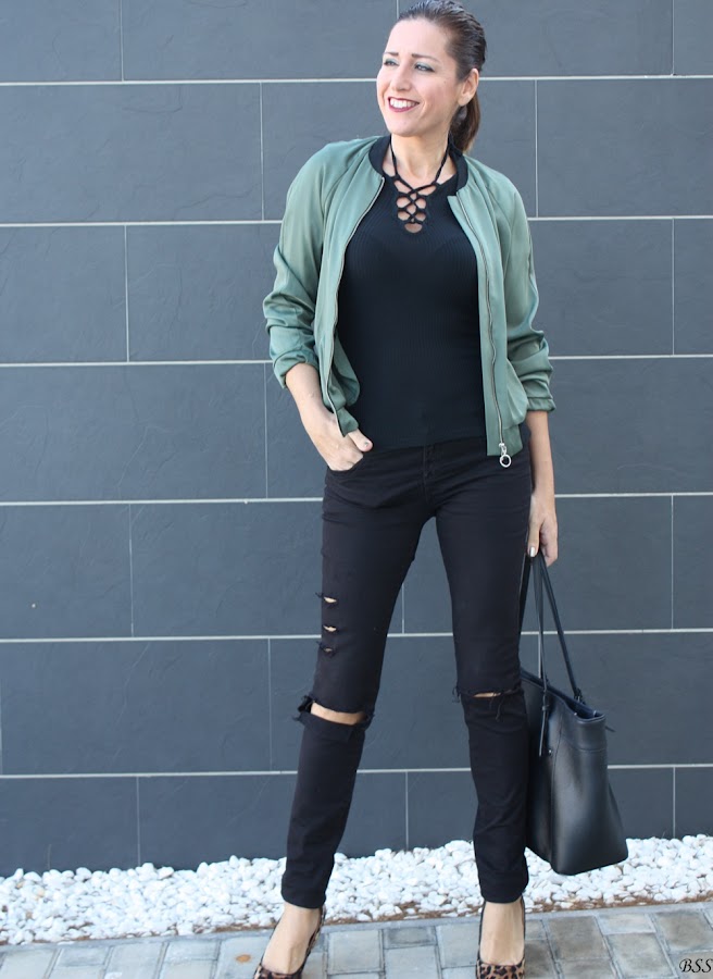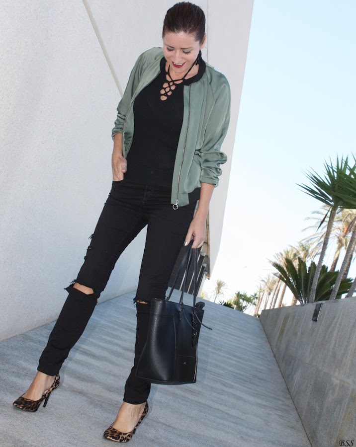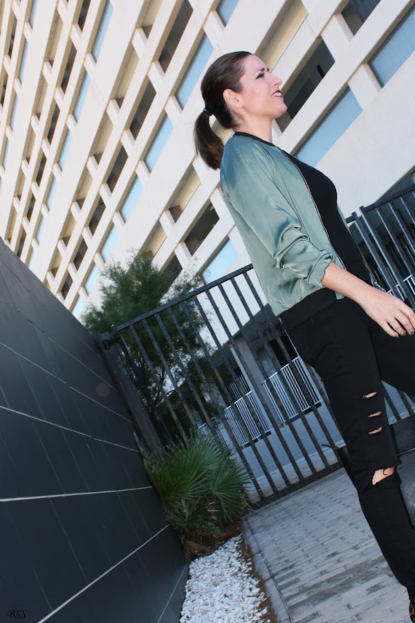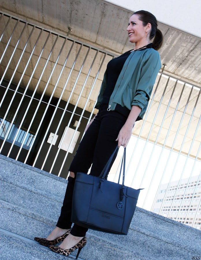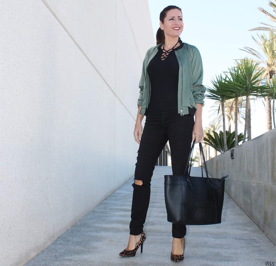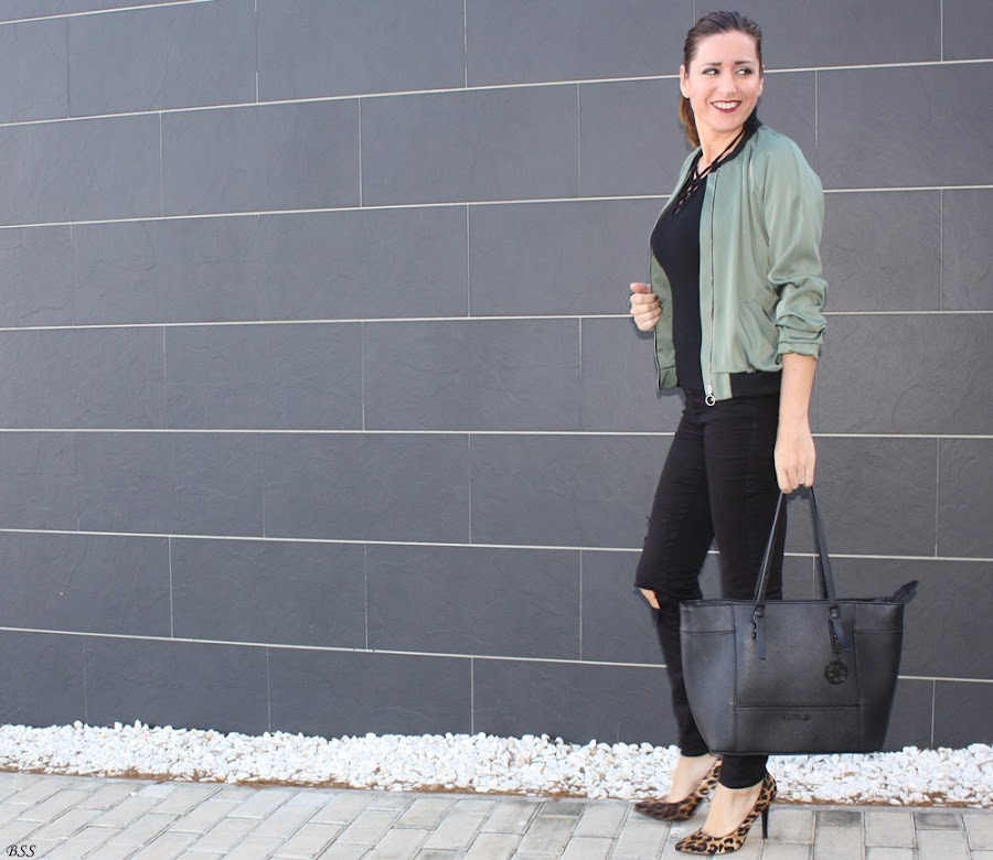 Esta es mi propuesta donde para realzar una Bomber en color verde metalizado he creado un total black, dando un toque print con estos preciosos stilettos.