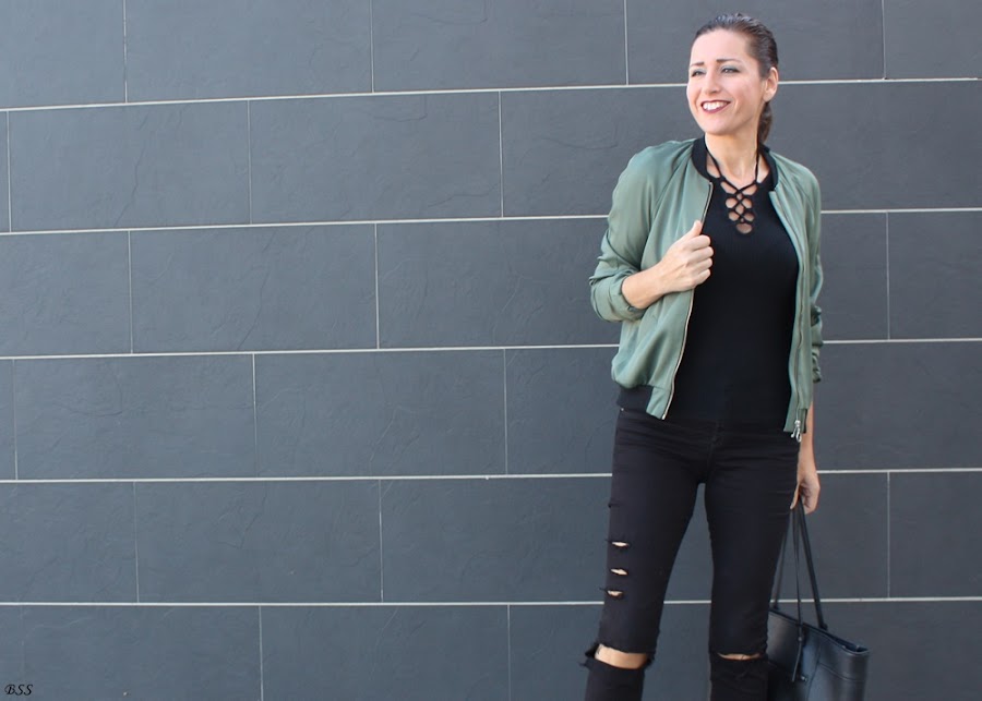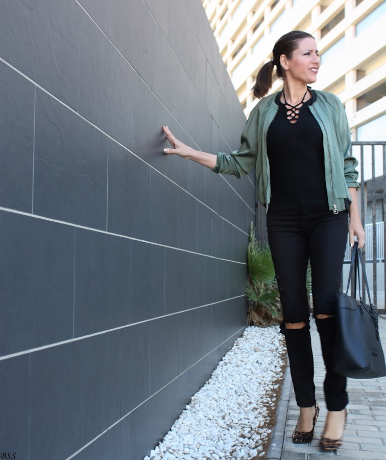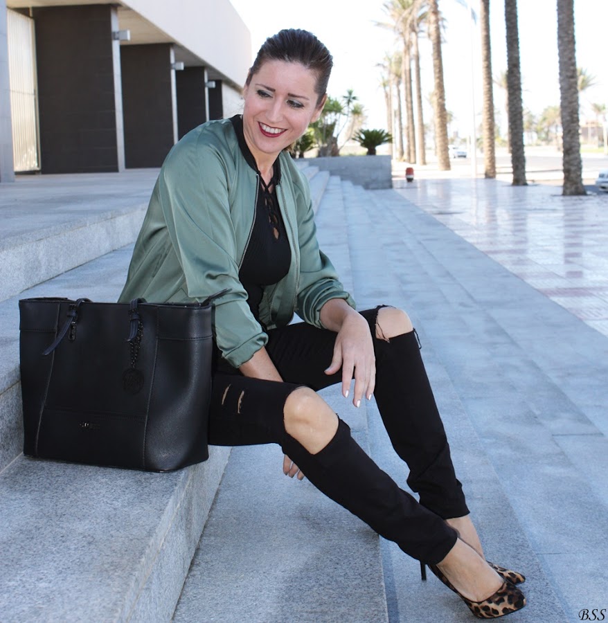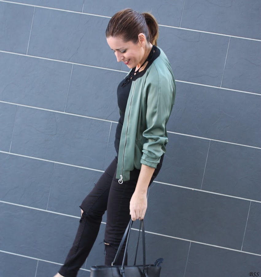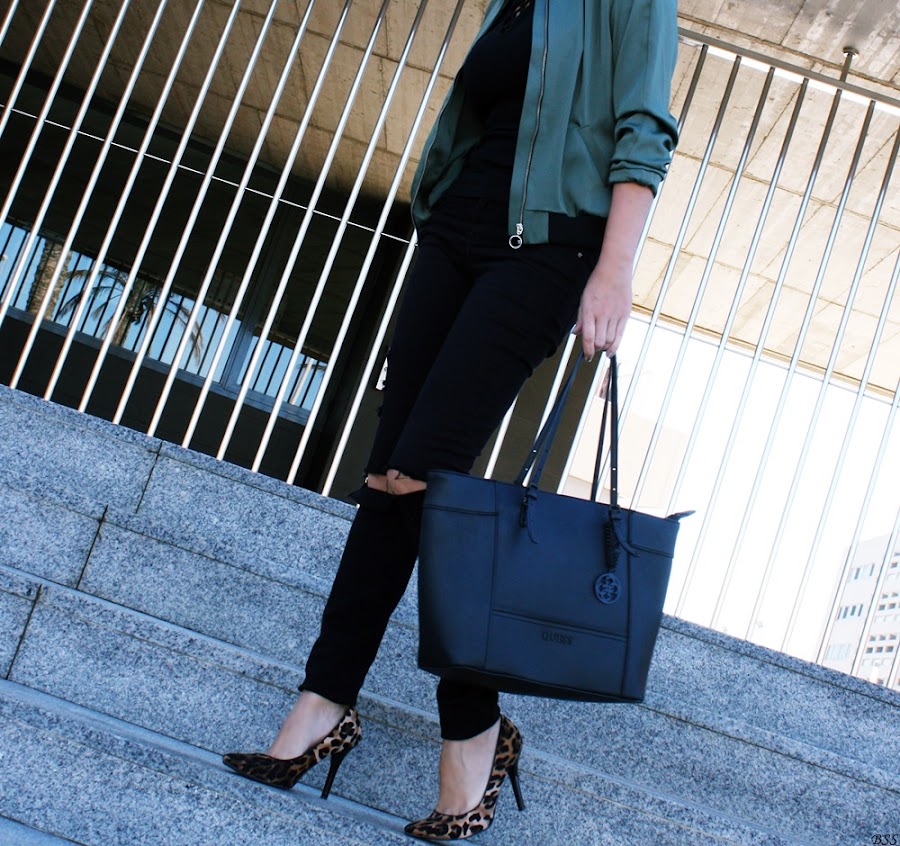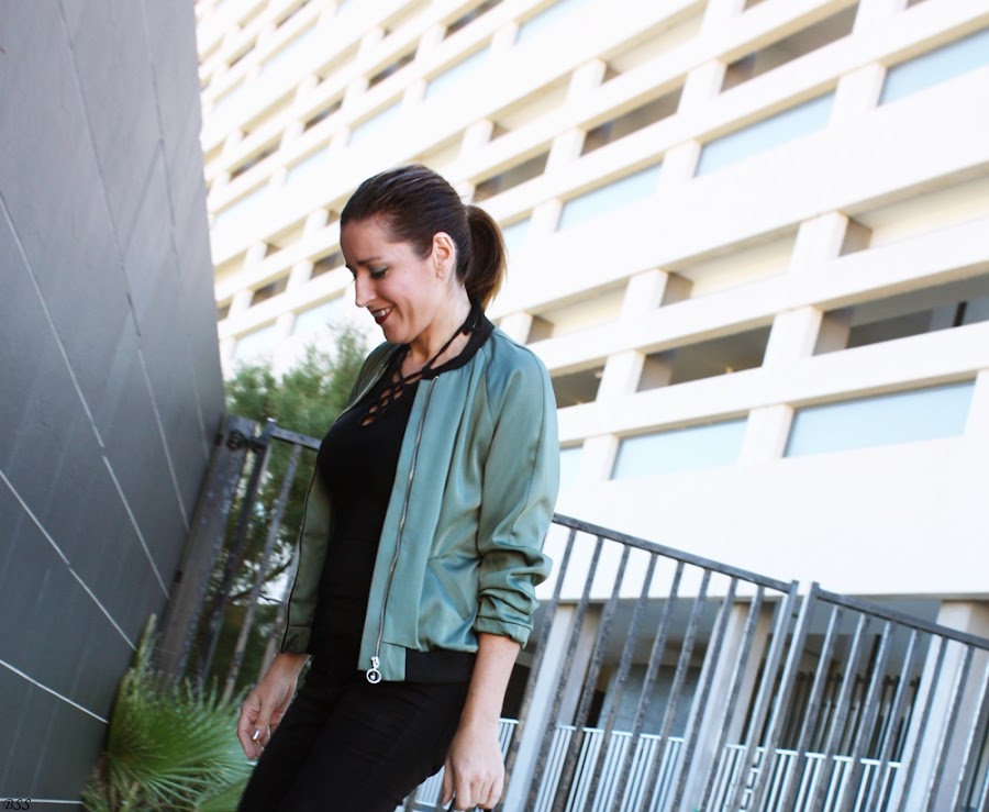 Esta es mi propuesta donde para realzar una Bomber en color verde metalizado he creado un total black, dando un toque print con estos preciosos stilettos.
