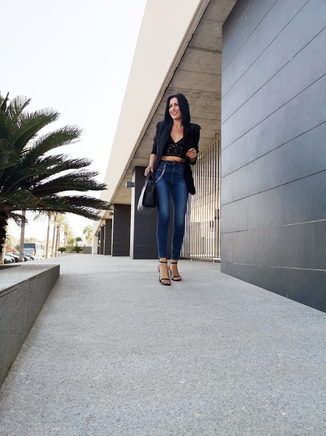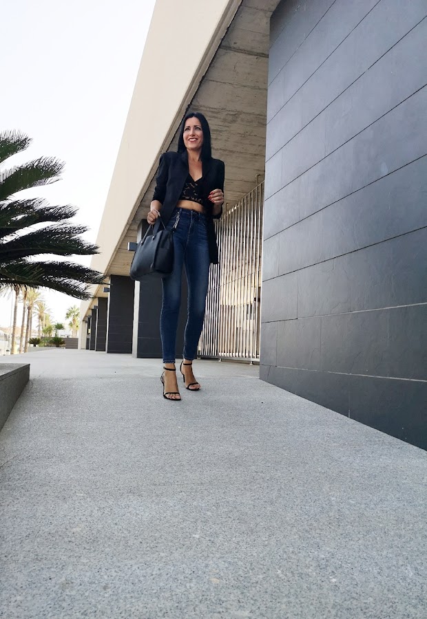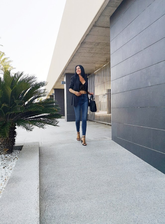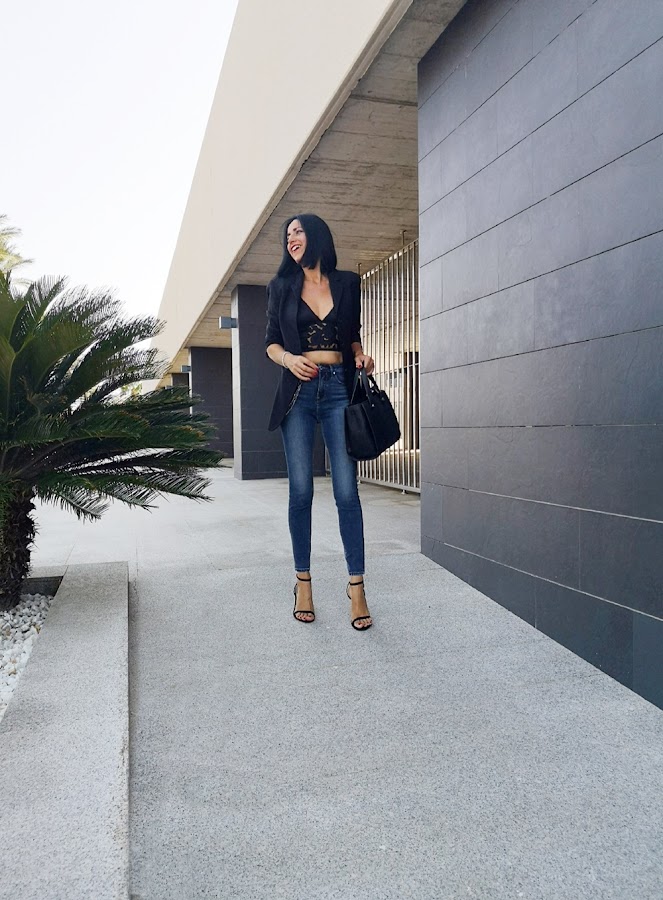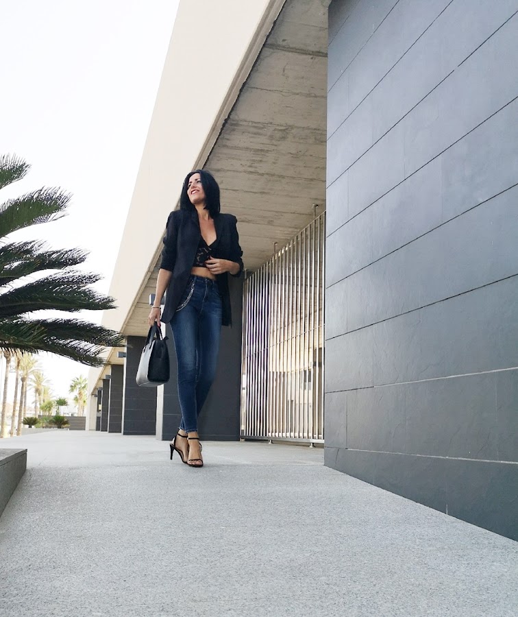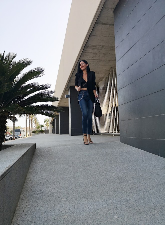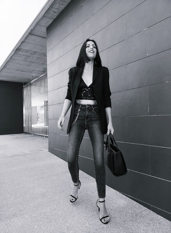 Este es de la nueva colección de Bershka en blonda y satén y aunque ya digo que solo no me lo pondría, me encanta combinarlo con jerseys de grandes escotes o con una blazer como en el caso de hoy.
