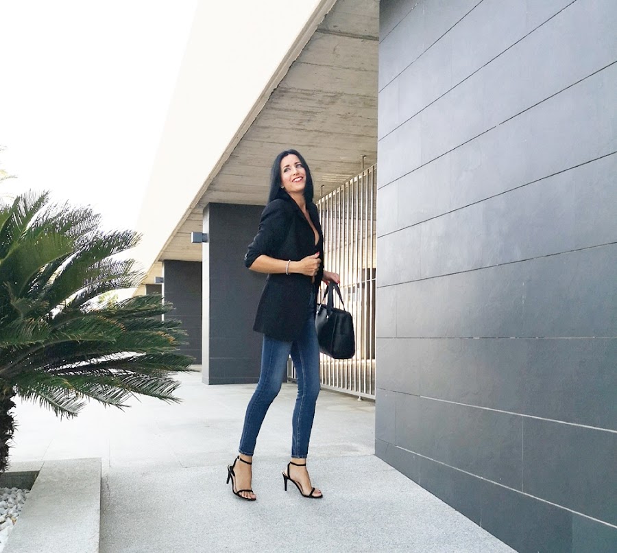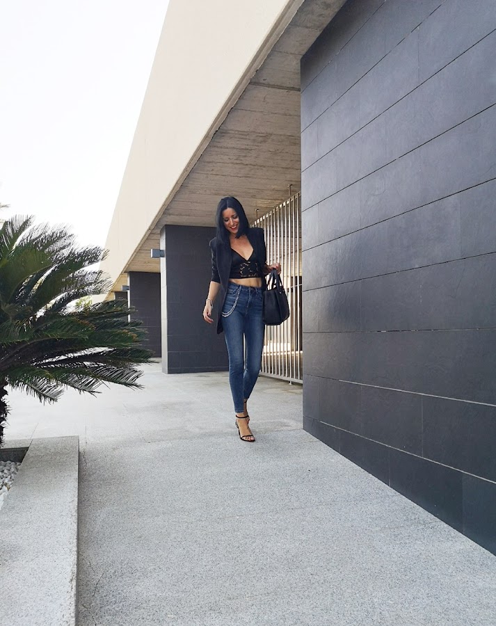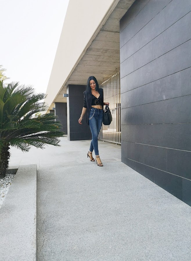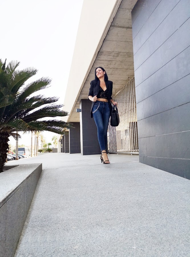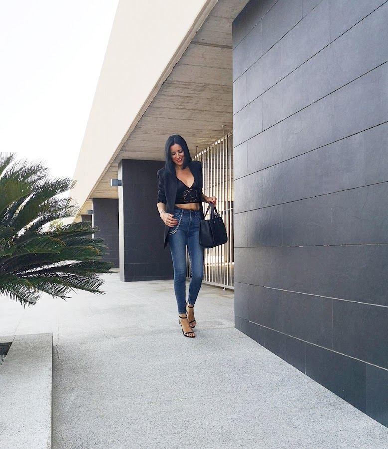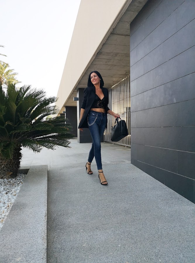 Este es de la nueva colección de Bershka en blonda y satén y aunque ya digo que solo no me lo pondría, me encanta combinarlo con jerseys de grandes escotes o con una blazer como en el caso de hoy.