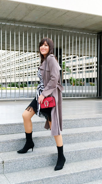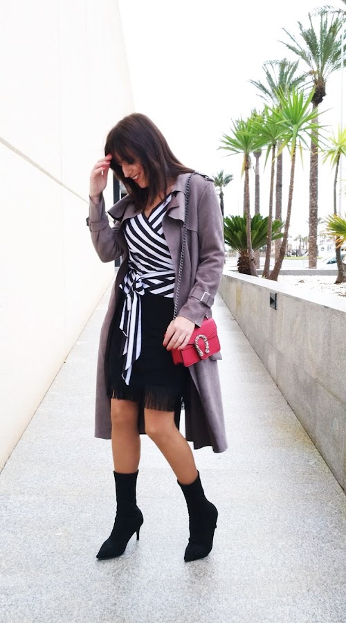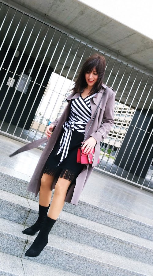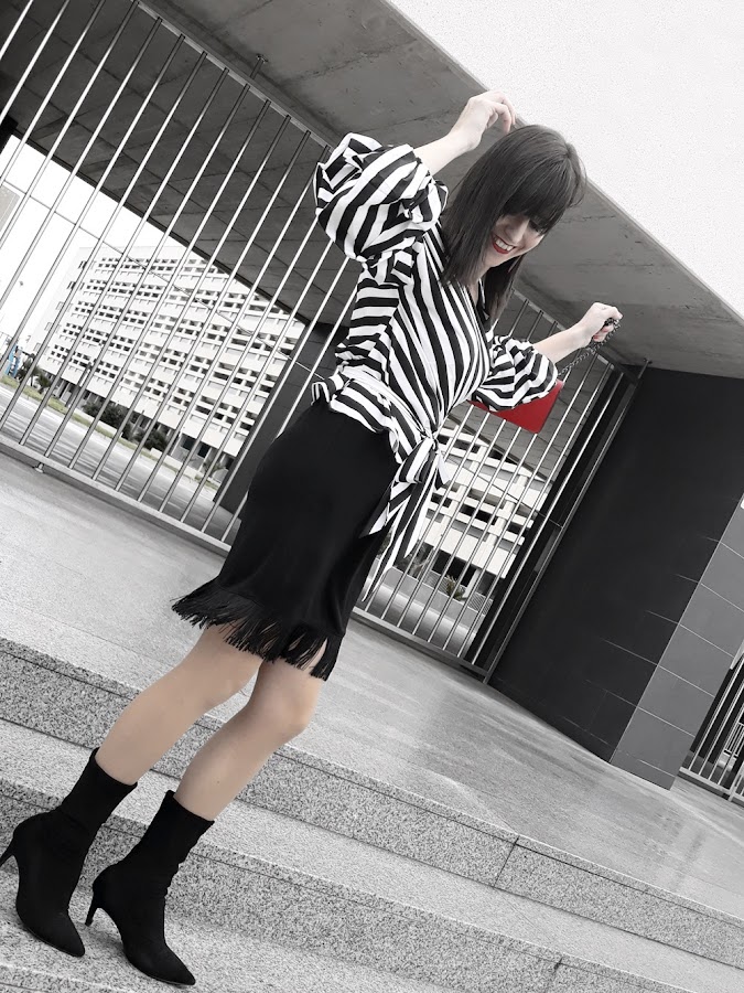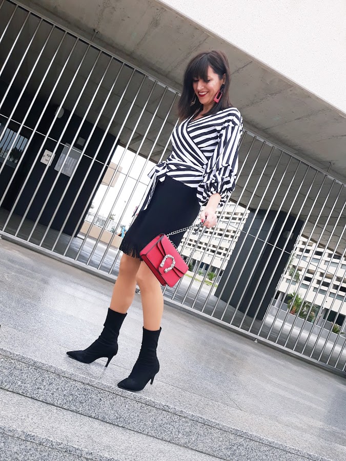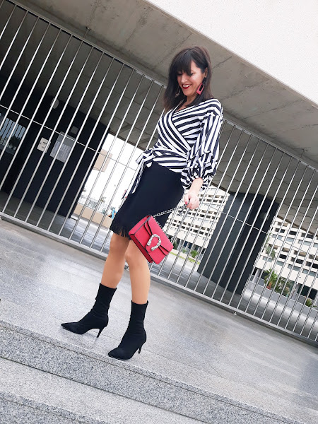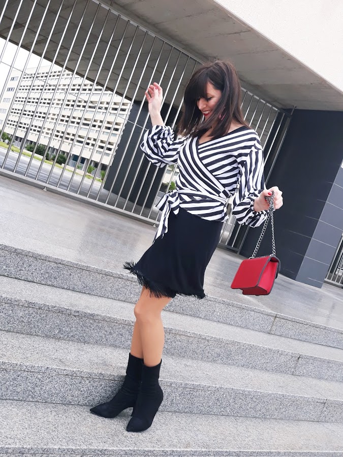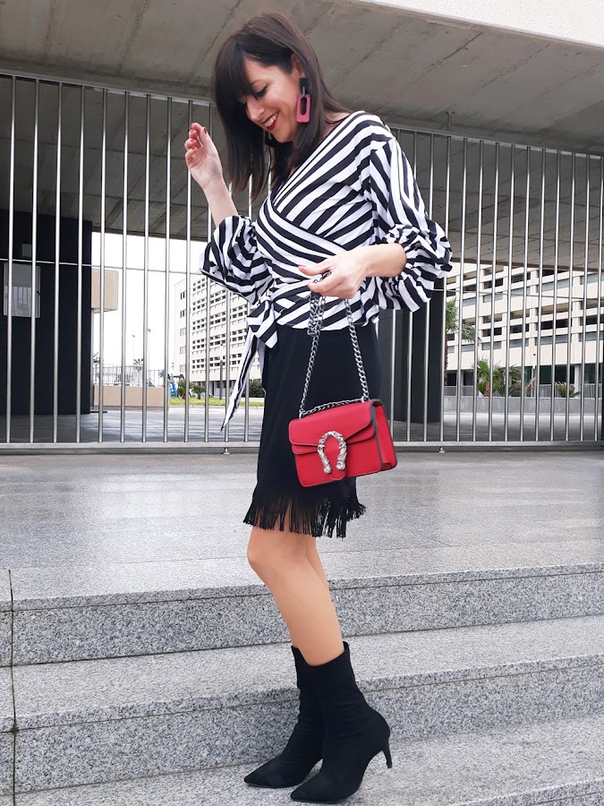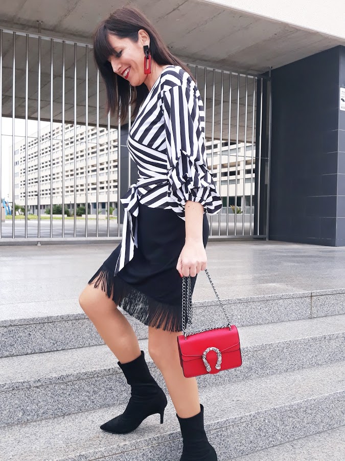 Hoy os traigo un look con una preciosa blusa cruzada de ZAFUL con la que oculto un vestido de flecos dando un toque de color con bolso y pendientes en color rojo.