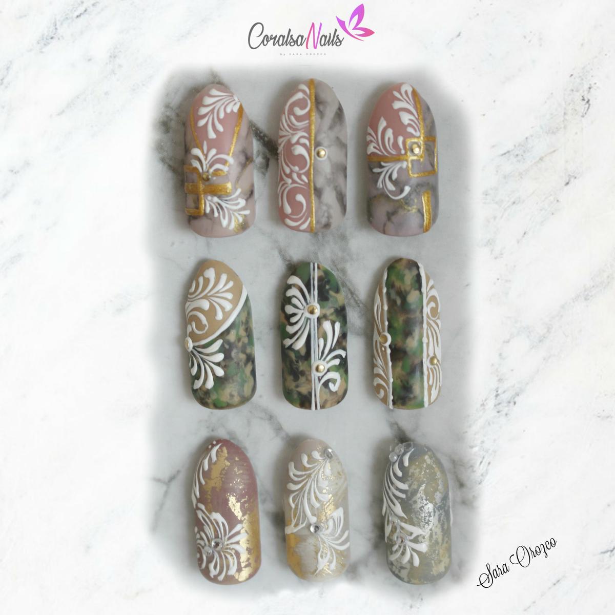 Con este look quedan muy bien las uñas tanto en marmoleado con estampado militar, como con las uñas nude y tonos marrones, ya que normalmente la ropa y complementos de este tipo suelen ir en esa gama de colores. Si le queréis dar un poco de color al estilismo incluso podéis probar a combinarlo con uñas en naranja, living coral o teja. Queda genial con esos tonos.