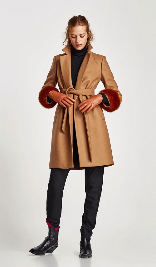 El clásico abrigo camel que nunca pasa de moda, lo tenemos con solapas, de lana y con pelo en las mangas. De Zara.
