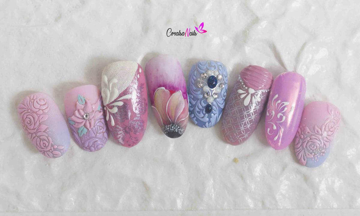 Se llevan mucho los diseños con flores y mariposas. En nuestra manicura también podemos lucir pedrería y foil de encaje de colores. Otra tendencia muy delicada es una manicura Baby Boomer combinada dibujos pequeñitos o esmalte de purpurina.